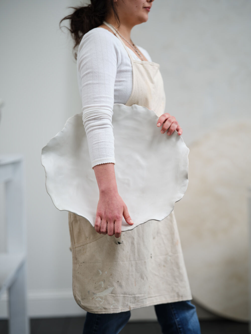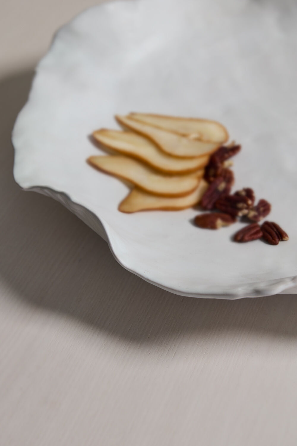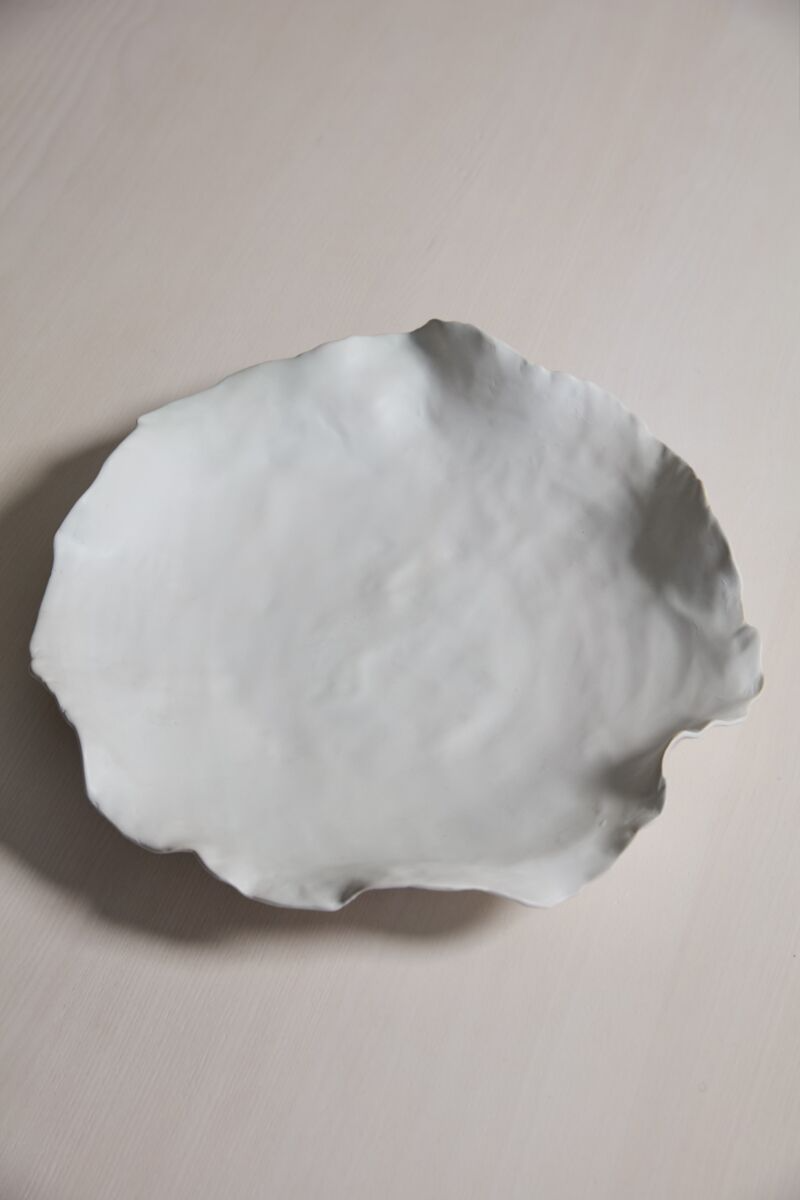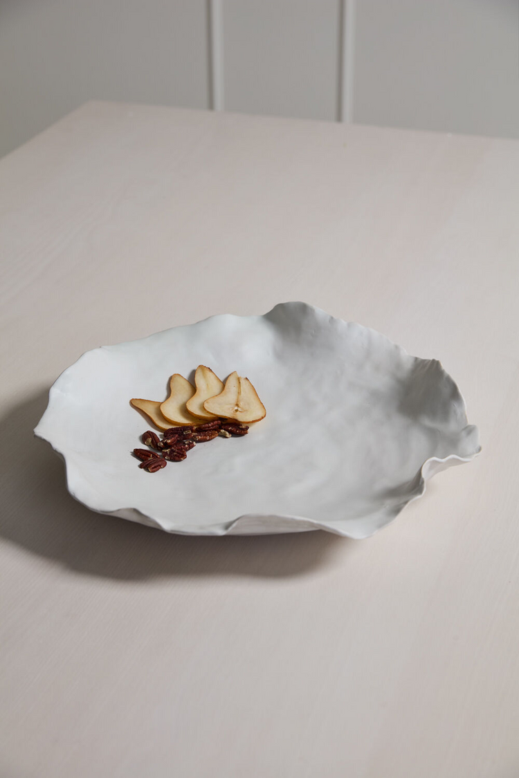 The Ayo Ceramic Bowl features a minimalist design that is both subtle and elegant, showcasing an organic, artistic form. Its wide, shallow shape delivers a strong decorative statement while maintaining a delicate feel. Crafted from thin ceramic with a warm white matte finish, the bowl's irregular rim adds refined character. Perfect for displaying decorative fillers or serving food, it enhances any setting with depth and sophisticated style.