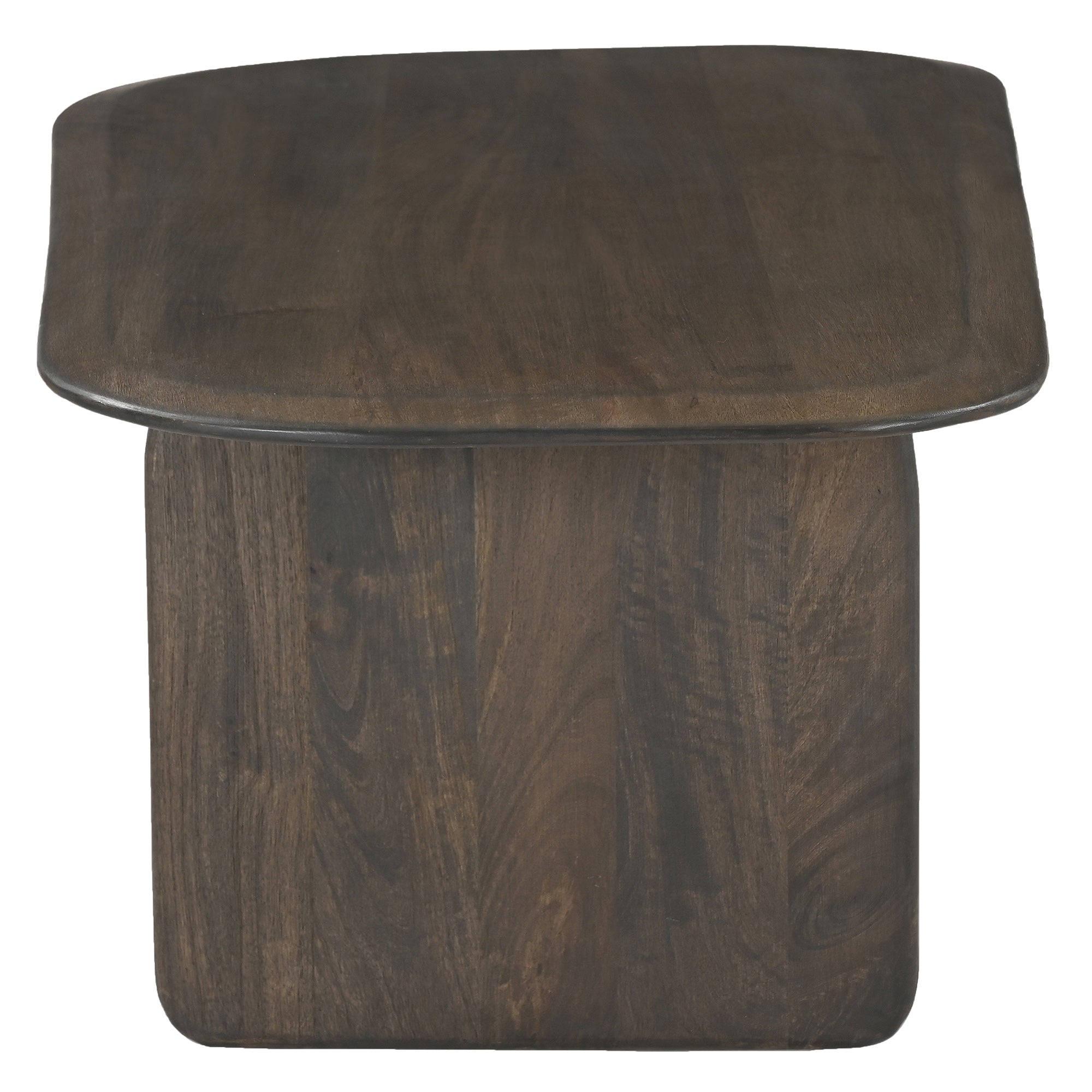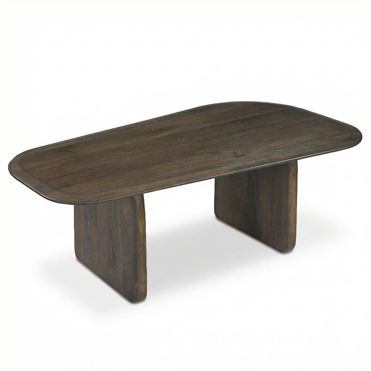The Ibile grounds a living room with its organic silhouette and the quiet warmth of solid mango wood. A rich mocha finish draws out the natural grain, while softly rounded edges on both the top and legs give the piece a sculpted, unhurried quality. The thick tabletop and sturdy slab legs are built from sustainably sourced mango wood, with natural variation in grain that makes each piece unique. Equally at home in a formal sitting room or a relaxed everyday living space.