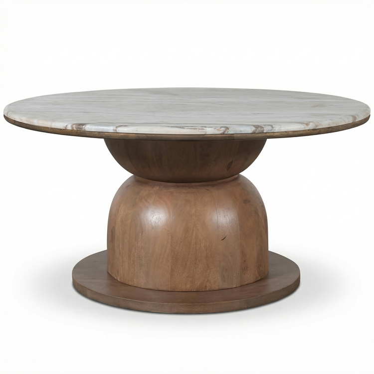 A sculptural solid wood pedestal base table with a rounded column and wide circular plinth, offering a balanced, architectural foundation. Topped with a marble slab top - Fantasy Brown has swirls of cream, grey, light and dark brown. Perfect for formal or casual living spaces, a true centrepiece.