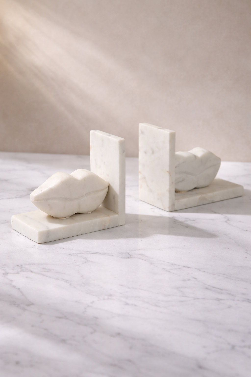 Enhance your shelving with this set of two 5" Poise Lips Marble Bookends in crisp white. Expertly carved from premium marble, each piece features a distinctive lip motif, bringing a subtle yet playful element to refined interiors. These durable marble bookends provide both practical support for your books and a sophisticated decorative accent ideal for offices or living rooms. Ideal for those who appreciate contemporary design, they infuse any space with elegance and character. Elevate your home décor with these expertly crafted accessories.