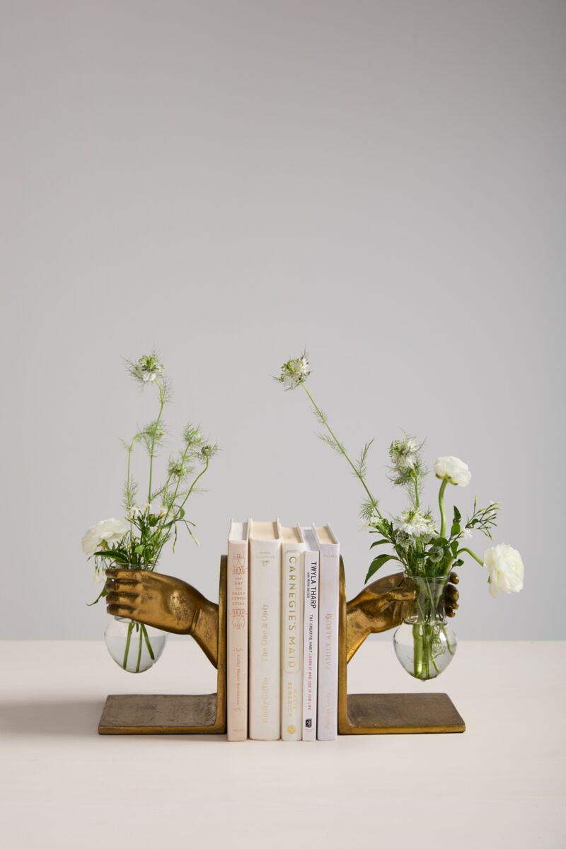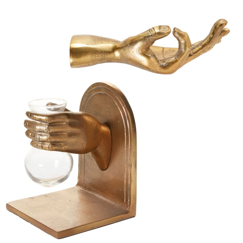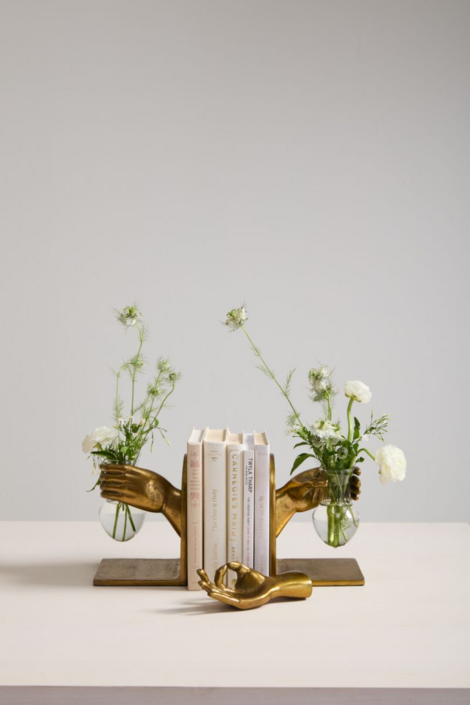 We all need a hand to hold, but especially one designed to hold a bundle of flowers & books. The recycled cast aluminum Handheld Bookend set in an antique gold finish features a recycled glass bud vase that's perfect for propagation clippings or a small floral arrangement.