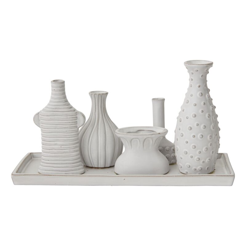 The Windowsill Budvase is a unique, sculptural piece that brings character and charm to any surface. Featuring five distinct budvase silhouettes fixed onto a single tray, it offers the look of a curated collection in one cohesive design. Each vase has its own texture and form, from ribbed to dotted, creating visual interest whether styled with fresh blooms, dried stems, or left empty as a decorative accent.