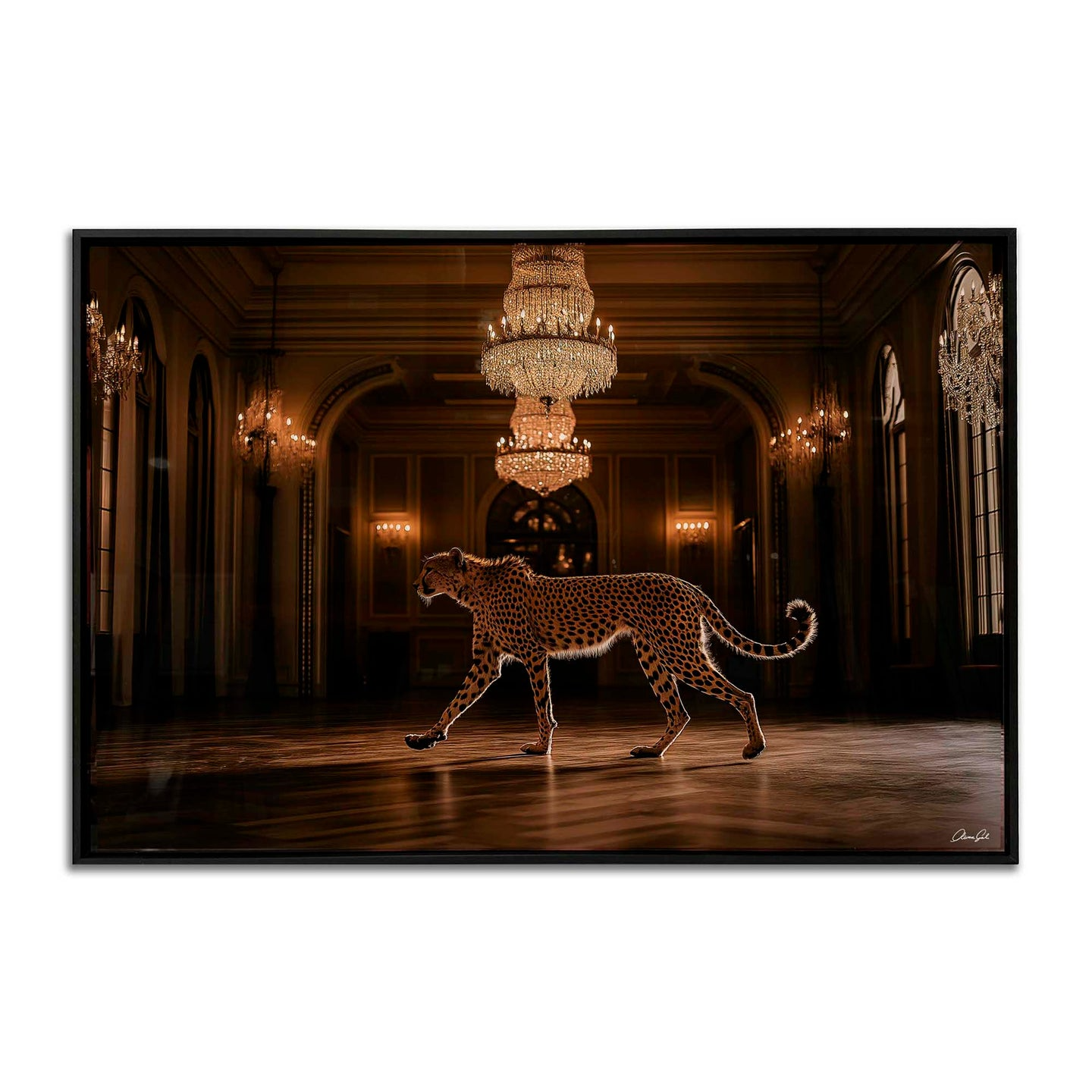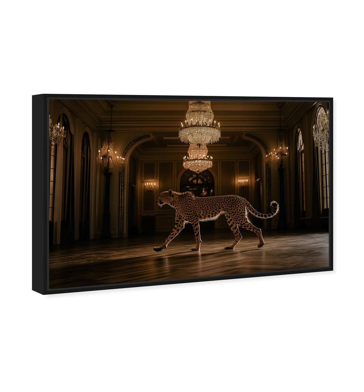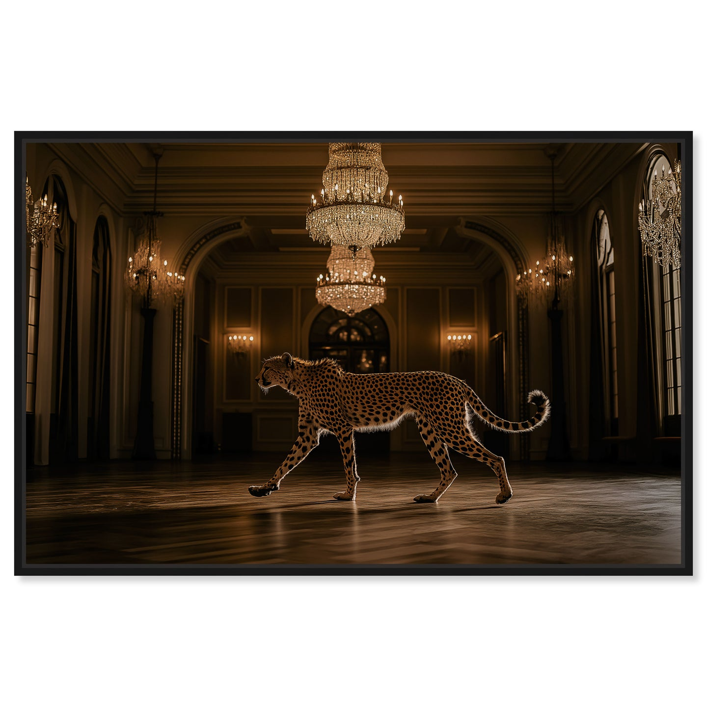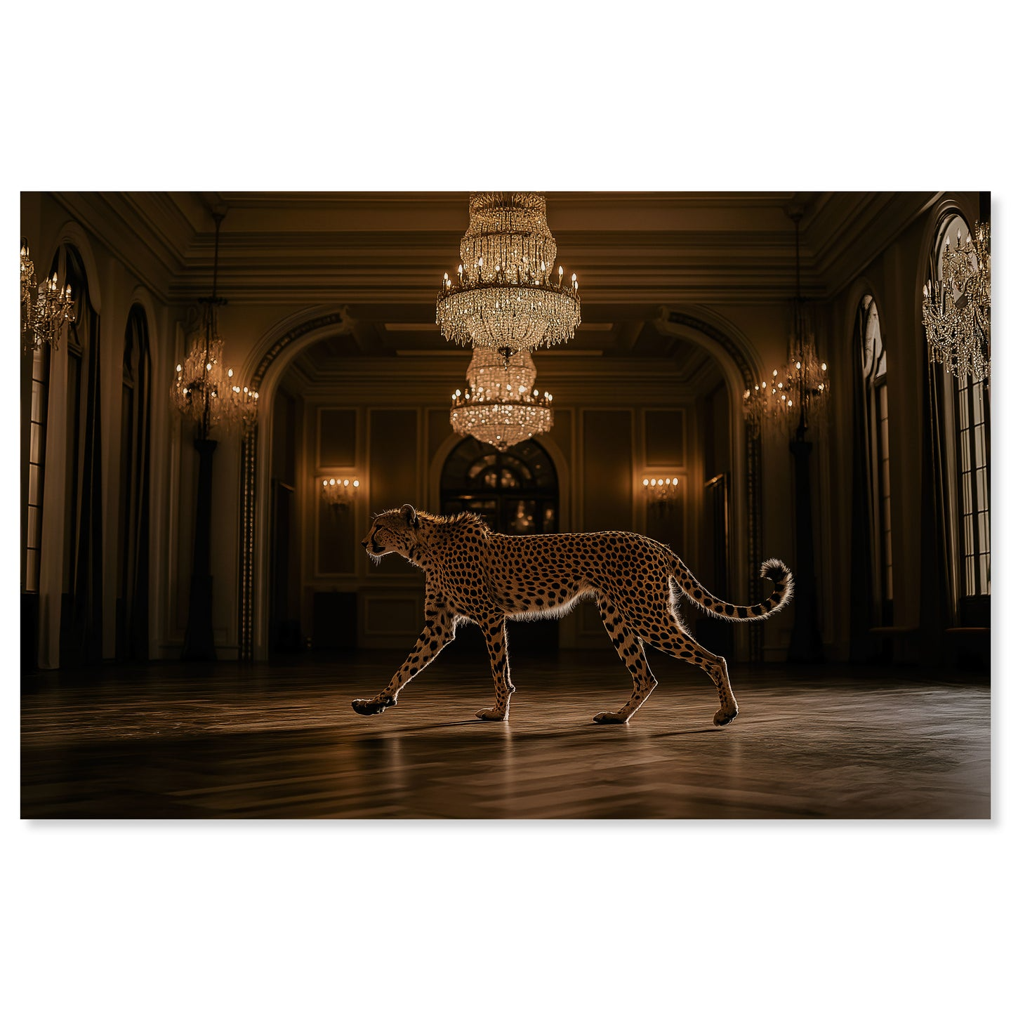 This commanding photographic artwork features a striking cheetah rendered in rich golden tones, designed to anchor any interior space. The sophisticated imagery demands prominence, making it perfectly suited for expansive walls and environments where bold visual statements elevate the atmosphere. Position this piece as your room's focal point—its inherent presence eliminates the need for competing decorative elements.