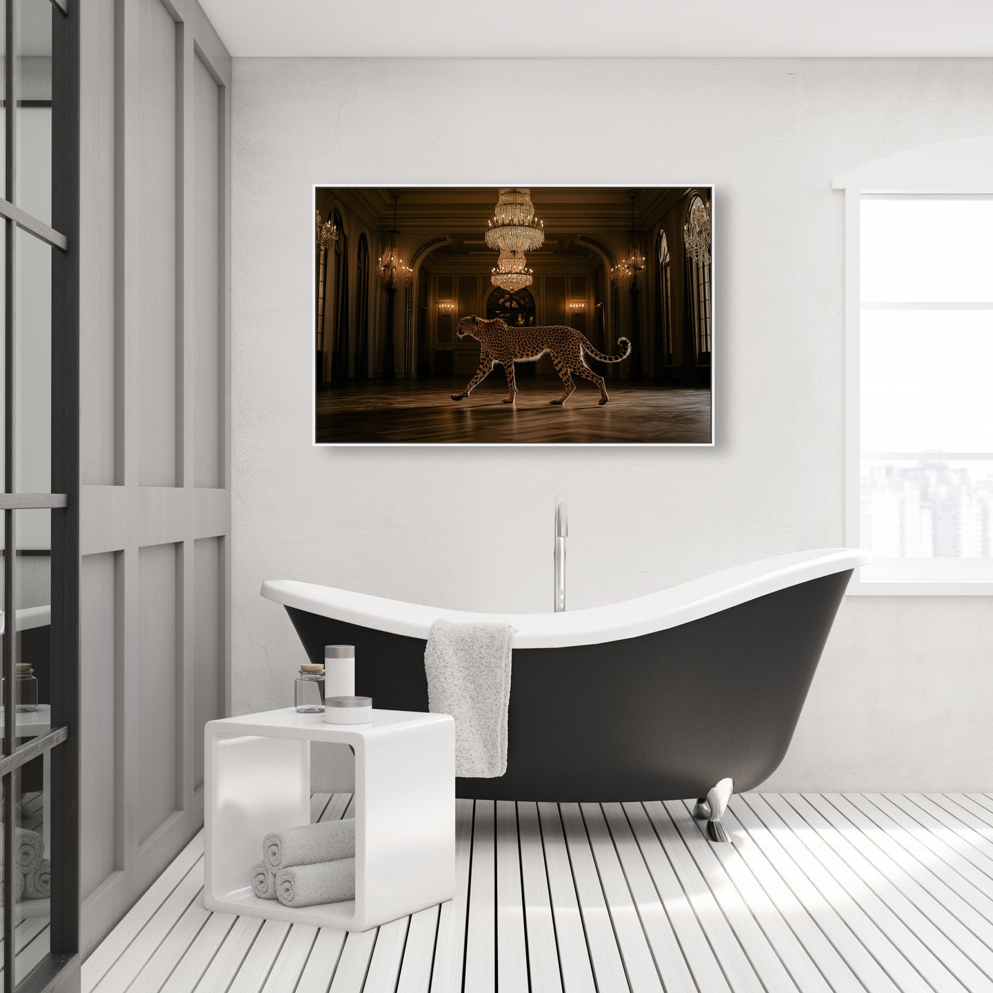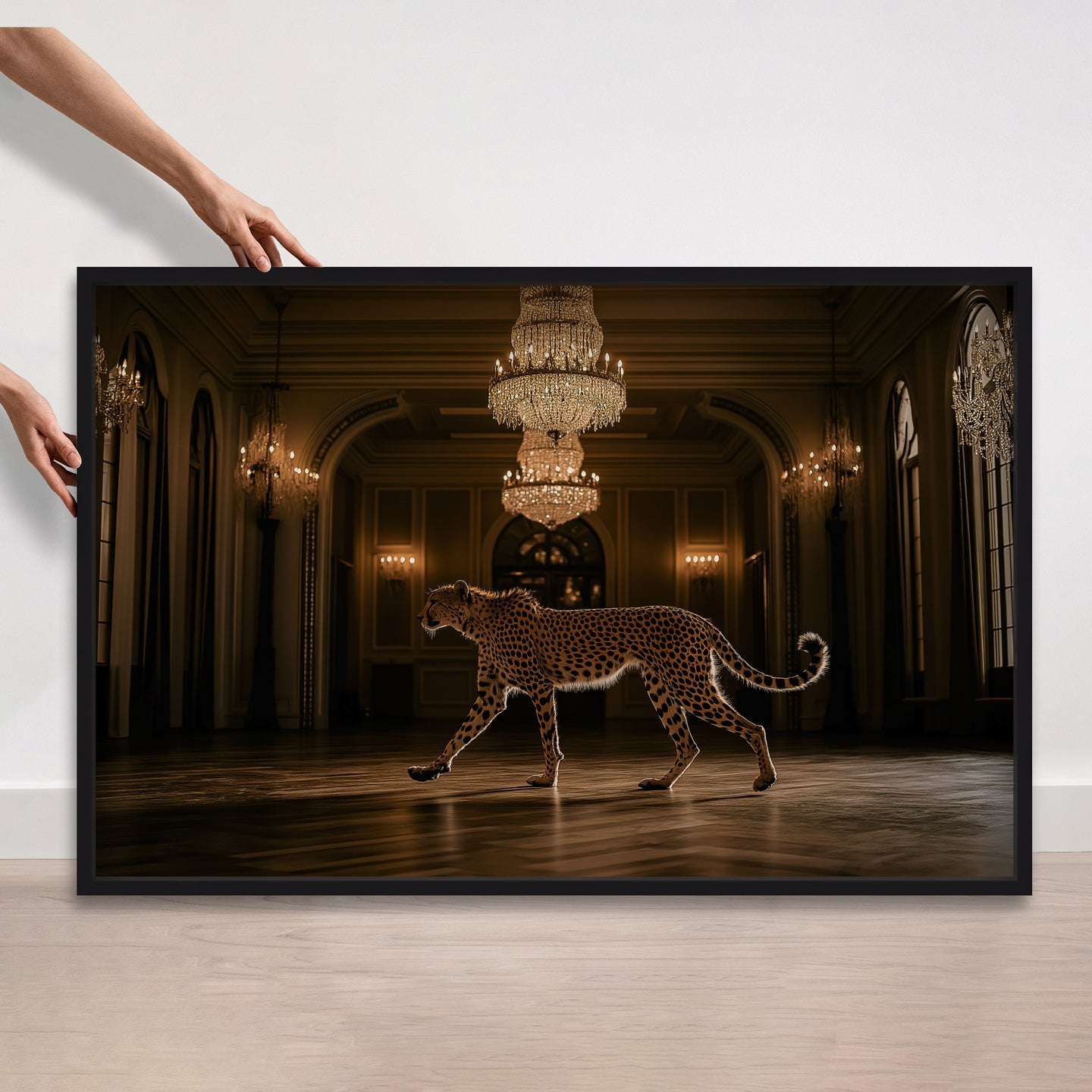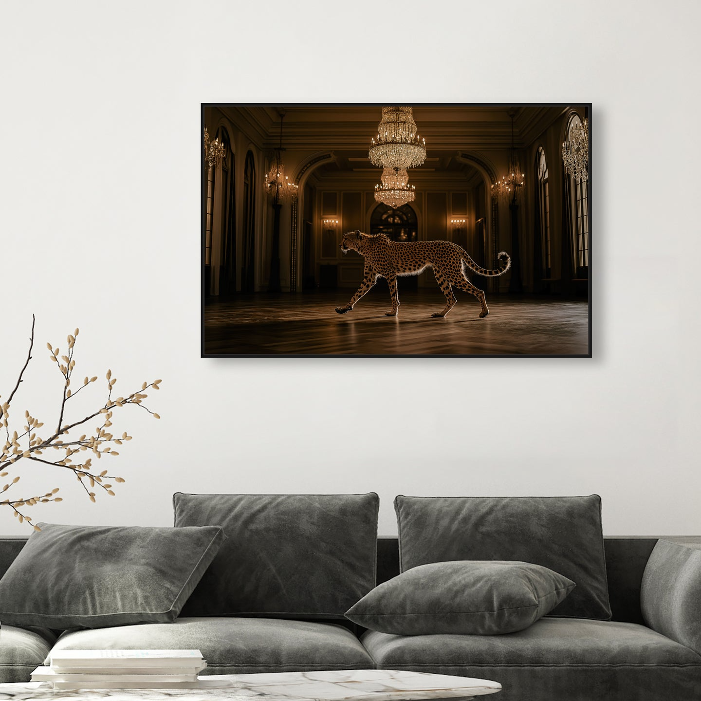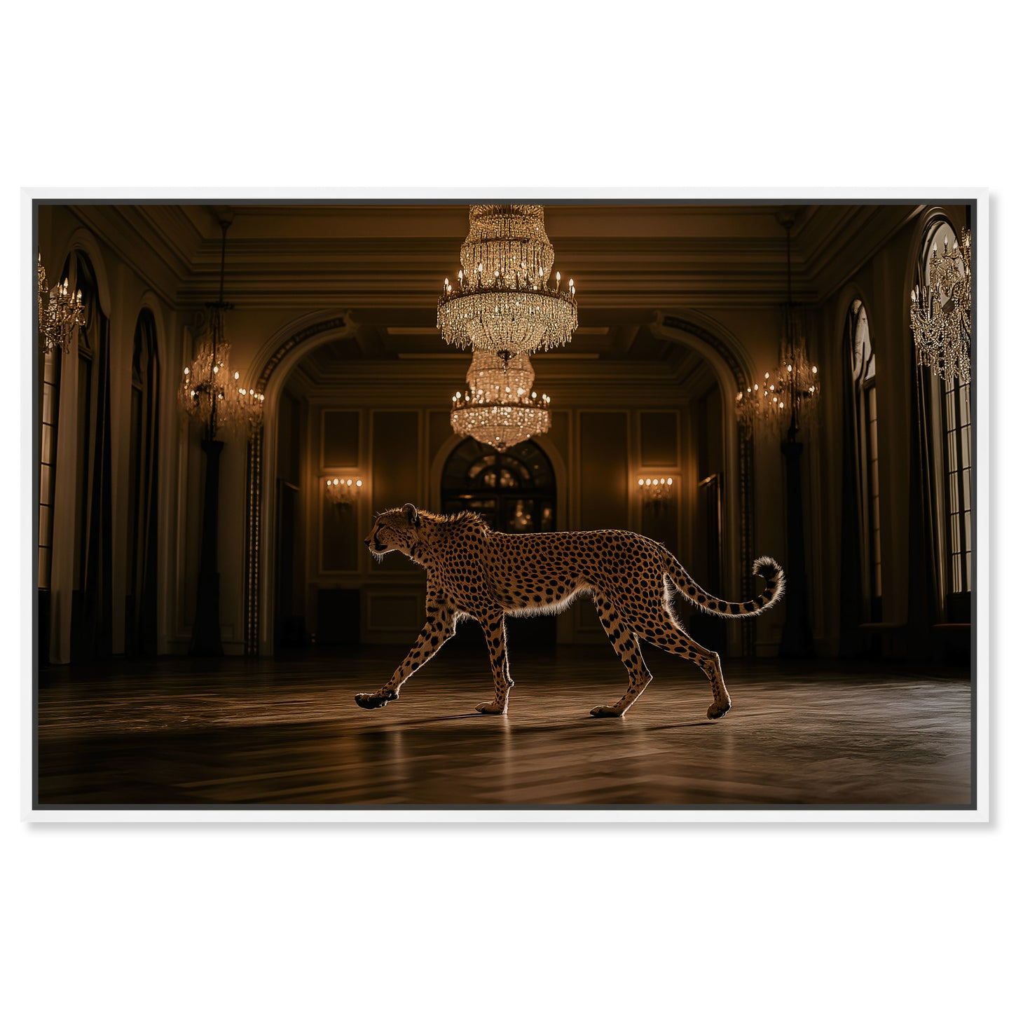 This commanding photographic artwork features a striking cheetah rendered in rich golden tones, designed to anchor any interior space. The sophisticated imagery demands prominence, making it perfectly suited for expansive walls and environments where bold visual statements elevate the atmosphere. Position this piece as your room's focal point—its inherent presence eliminates the need for competing decorative elements.