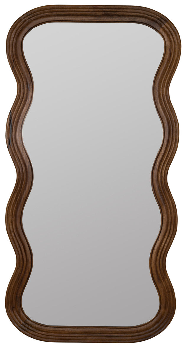 Framed in rich walnut wood, the mirror highlights natural grain patterns and warm tonal depth, adding character and visual interest from every angle. The gently undulating form feels both modern and expressive, making it as much a work of art as it is a functional accent.