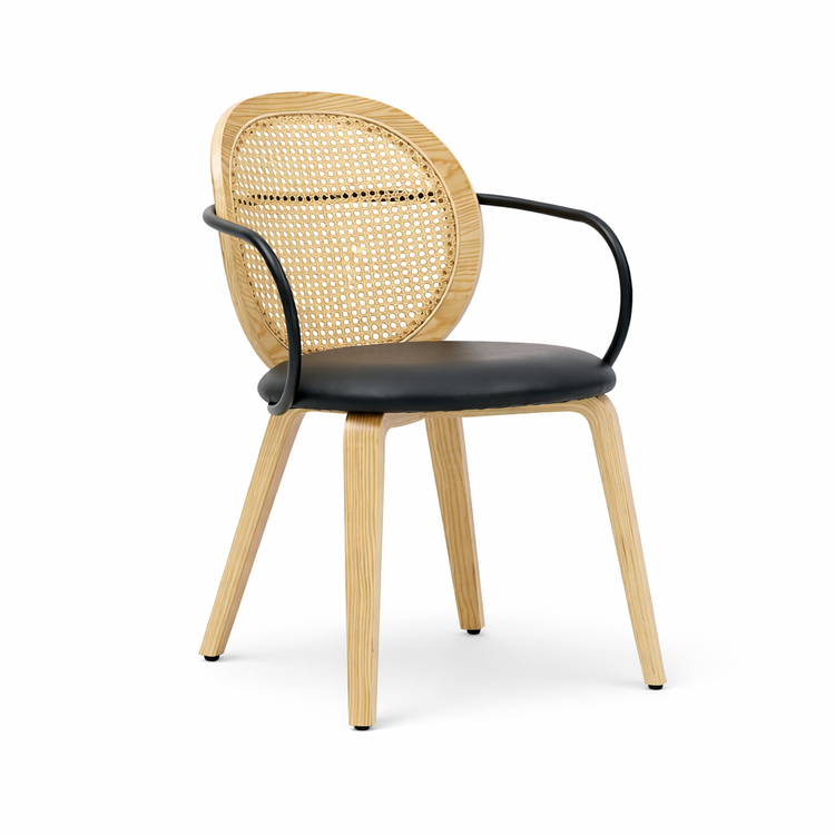 These sophisticated dining chairs blend contemporary design with understated charm. Featuring a faux rattan backrest that softens the silhouette, they're anchored by sleek black metal arms and a cushioned black faux leather seat for refined comfort. The light oak bentwood frame and legs deliver warmth and structural integrity, while the medium-firm polyester foam cushion ensures lasting support through countless meals. Equally at home in formal dining rooms or relaxed farmhouse kitchens, this set of two chairs offers versatile style without compromise.