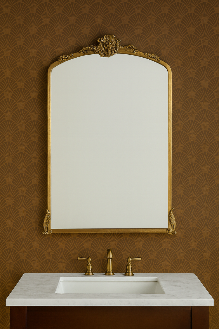 The Ella Mantle Ornate Medicine Cabinet elevates bathroom design with its distinctive gold-finished frame and mirrored facade. Engineered from durable polyurethane, this cabinet withstands daily use while maintaining its contemporary aesthetic. Three adjustable glass shelves provide customizable storage capacity for toiletries and personal care items. The integrated 4-hole hanger system enables secure installation in either surface or recessed configurations, accommodating different wall types and design preferences. A refined storage solution that functions as both practical organizer and decorative statement piece.