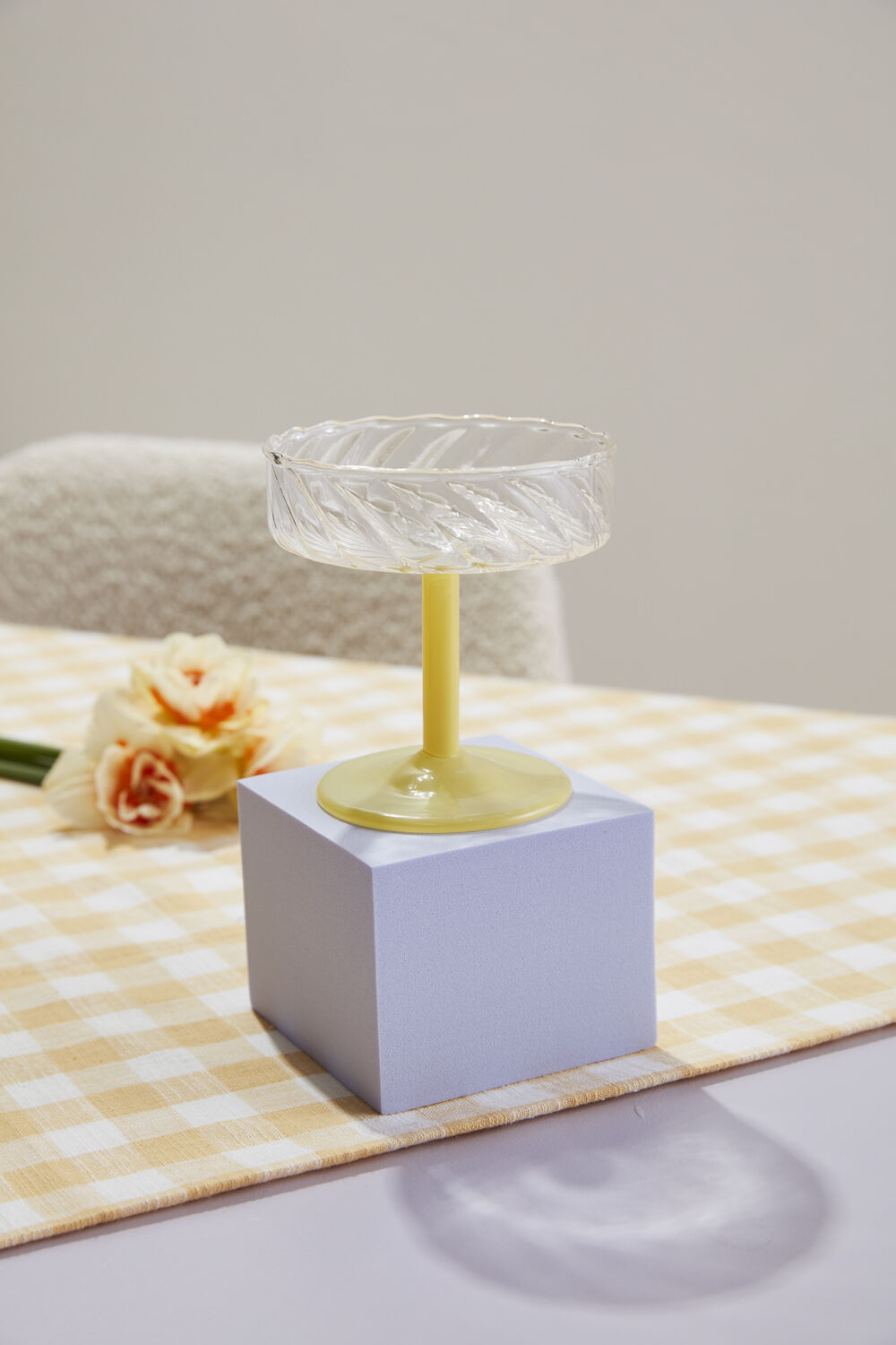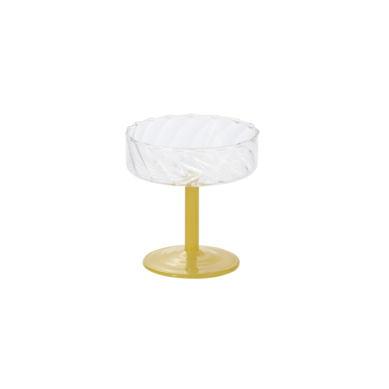 Toast in timeless style with the Gelato Mouth-Blown Coupe Glass. Standing 4.5″ tall with a 4.25″ shallow bowl, this piece pays homage to the classic cocktail coupe—now reimagined in uplifting yellow or blush-peach glass. The curved-optic surface creates subtle ripples of light, while the slender stem ensures a comfortable grip and minimal heat transfer. Perfect for Champagne, sparkling cocktails, or festive spritzers, it’s the on-trend touch your spring parties, summer soirées, and wedding toasts deserve. Hand wash recommended to keep its artisanal charm bright and clear.
