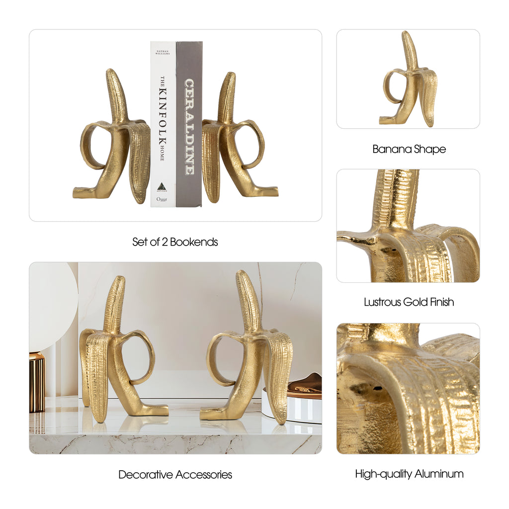 Elevate your decor with our Gold Banana Bookends, a captivating duo that not only serves a functional purpose but also a decorative one. Crafted from durable resin and finished with a lustrous golden sheen, these bookends are a striking statement piece. Measuring at a convenient size, they effectively anchor your literary collection without overwhelming the shelf. Their exquisite design and radiant finish make them an excellent gift for book lovers or a chic addition to your personal home decor.