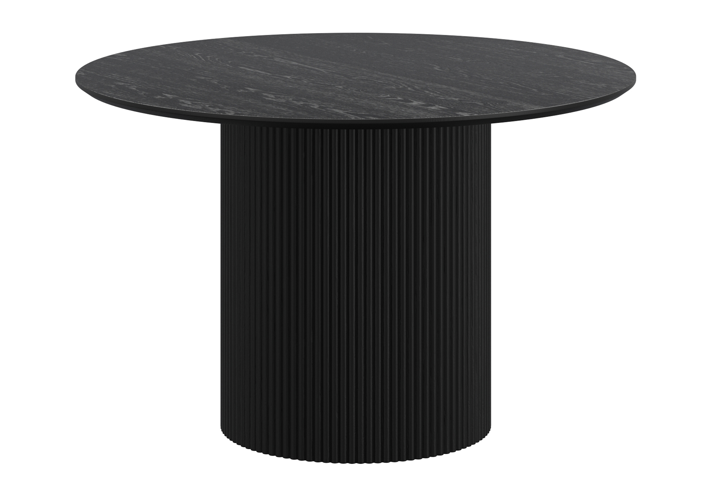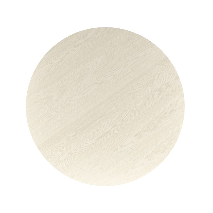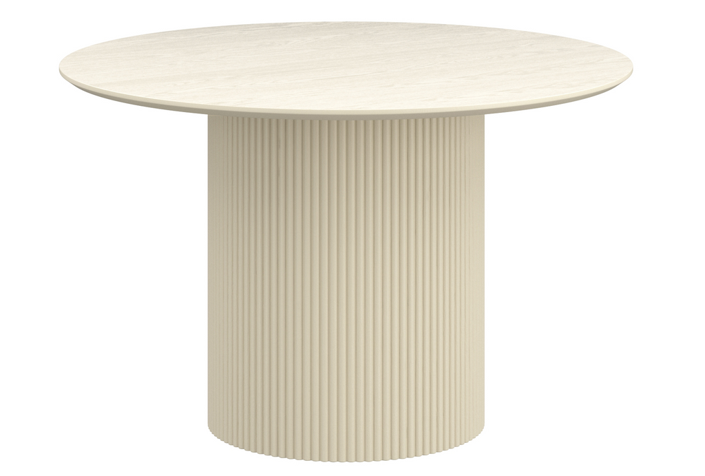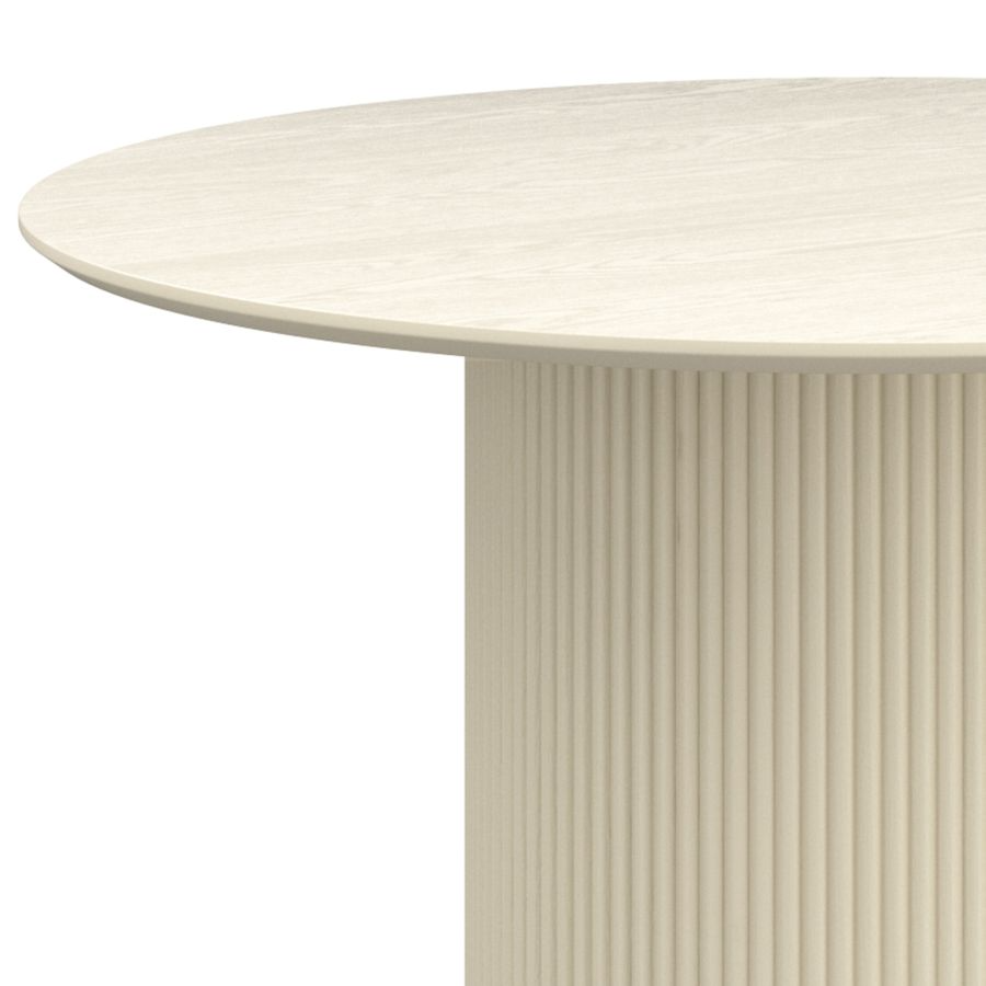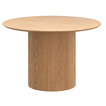 This mid-century modern round dining table combines timeless design with practical durability. It features a sturdy pedestal base with elegant reeded detailing, providing both stability and style. The tabletop showcases a realistic laminated oak veneer with visible wood grain, finished with a contemporary reverse bevel edge.