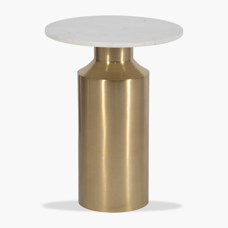 Add a touch of sophistication to your home with our Marble Topped Pedestal Side Table. Standing at 22 inches high, this elegant side table features a pristine white marble top paired with a sleek gold cylinder base, offering a perfect blend of modern design and timeless elegance. Ideal for displaying décor or serving drinks and snacks, this versatile piece brings a subtle touch of glamour to any room. With its compact size, it effortlessly fits into smaller spaces while providing ample surface area for your essentials.