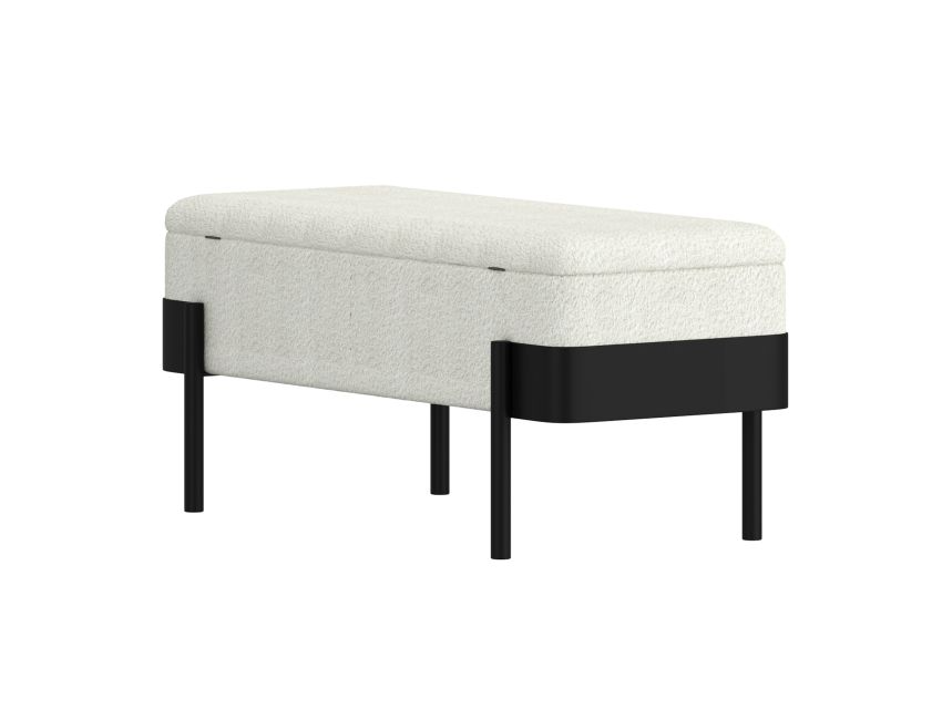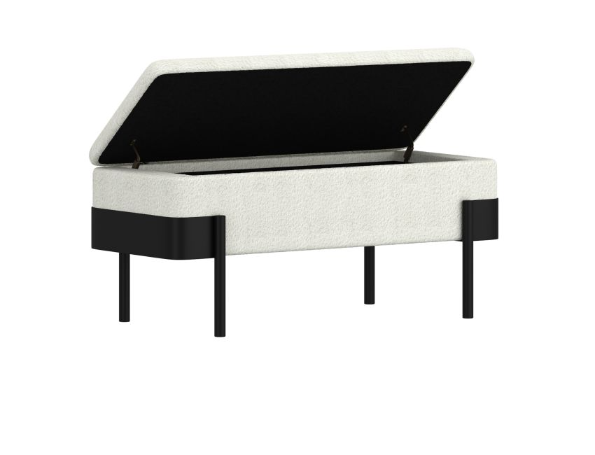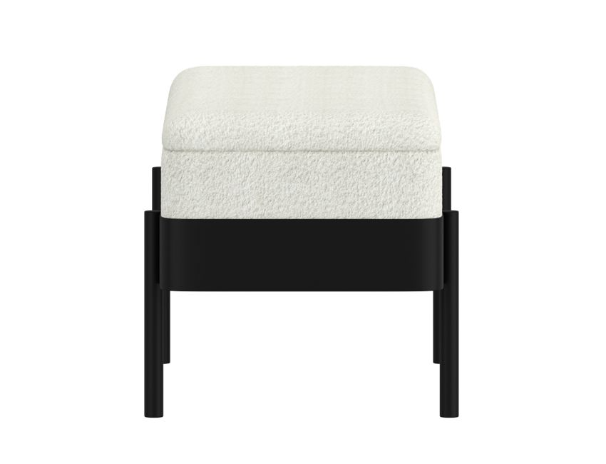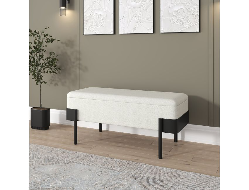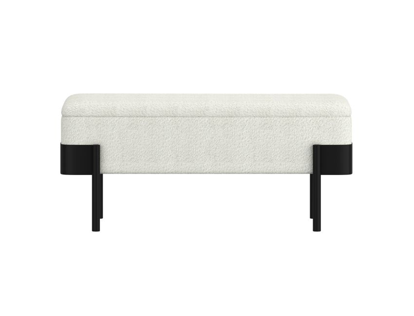 The Odell Storage Bench merges practical functionality with contemporary design through its dual-purpose construction. Upholstered in soft ivory boucle and anchored by a sleek black metal frame, this piece serves as additional seating, a footrest, or hidden storage solution. The cushioned top features medium-comfort polyester foam for everyday use, while safety-stop hinges ensure controlled closure of the storage compartment. The contrasting metal framework delivers modern sophistication, making this ottoman an intelligent addition to living rooms, bedrooms, or entryways where both style and storage capacity are valued.