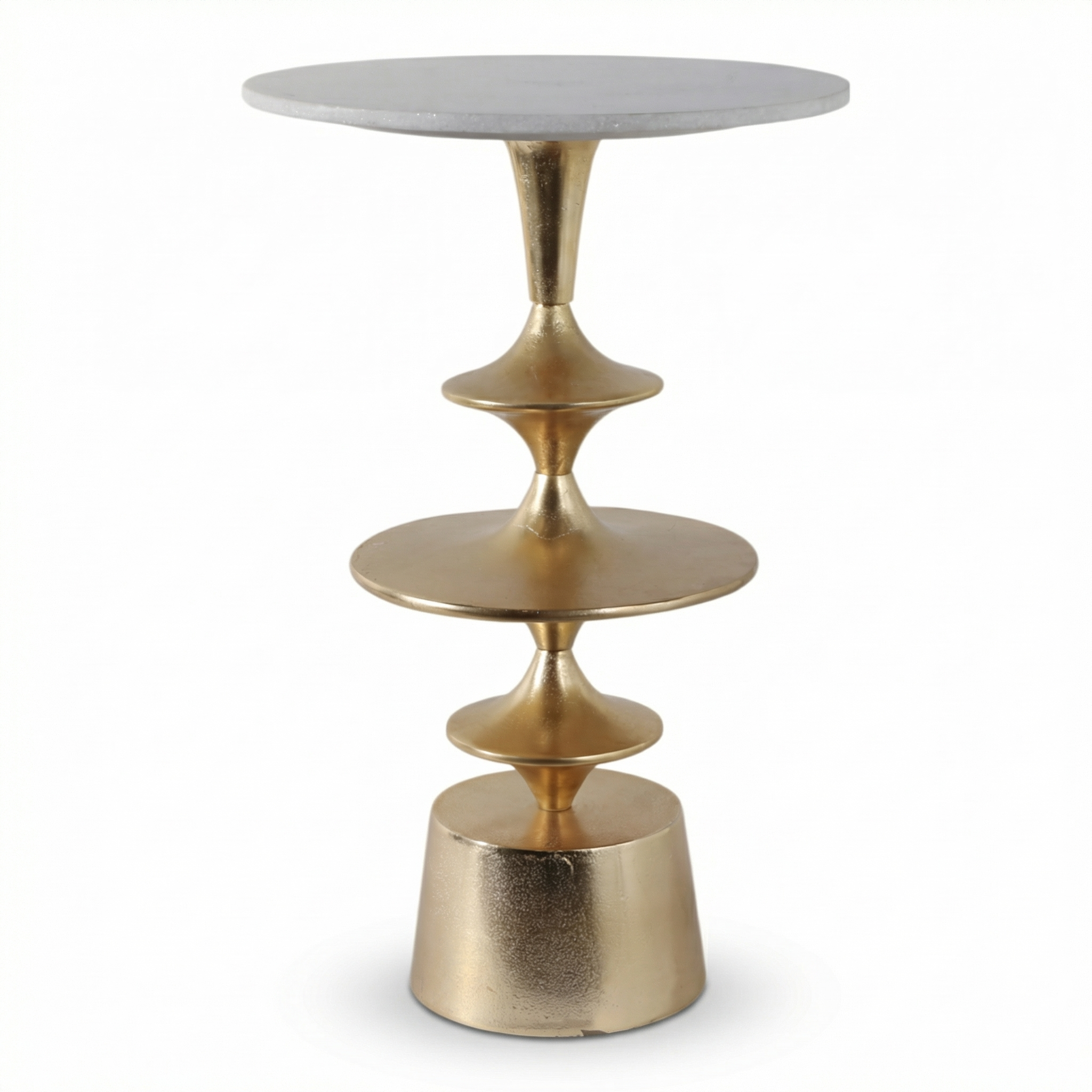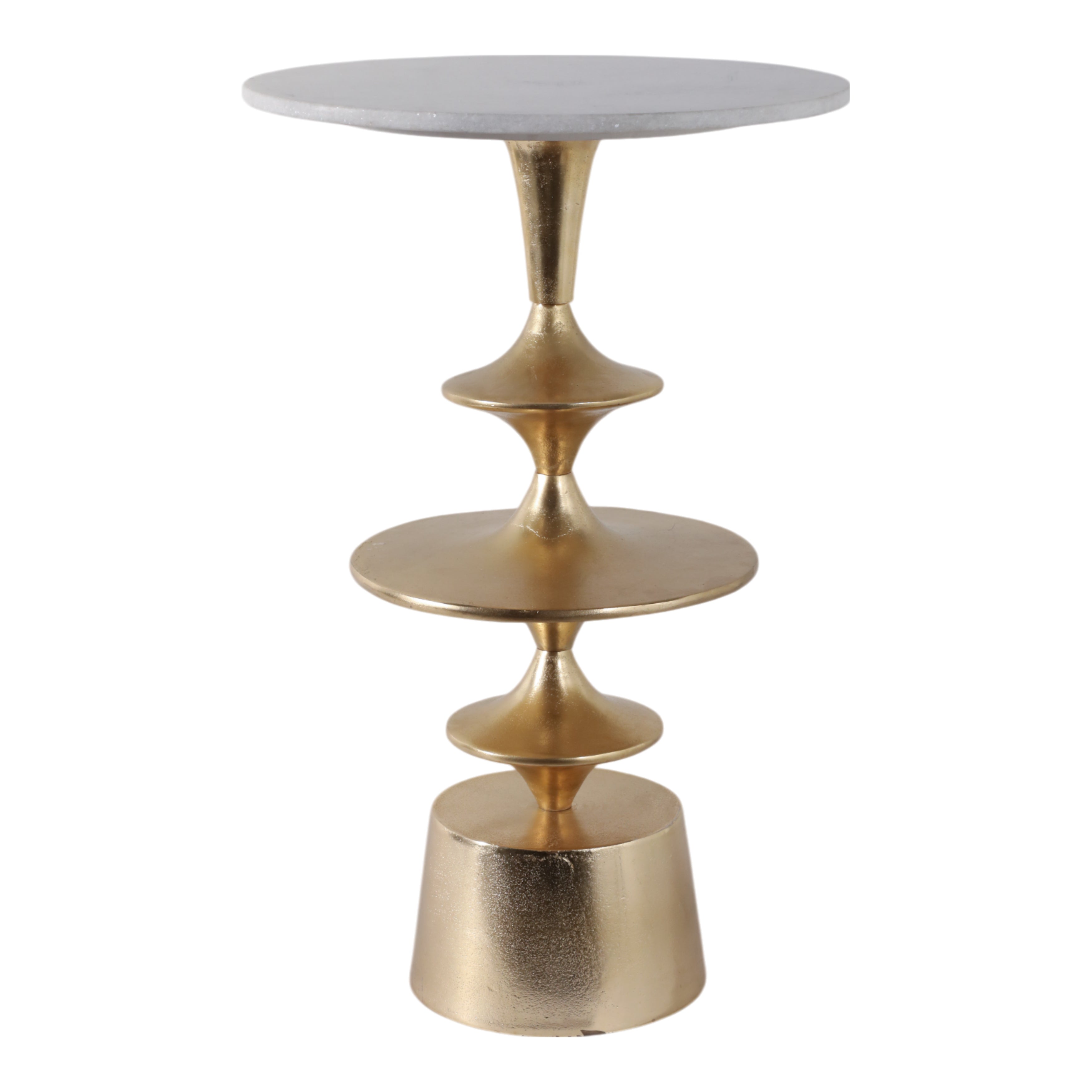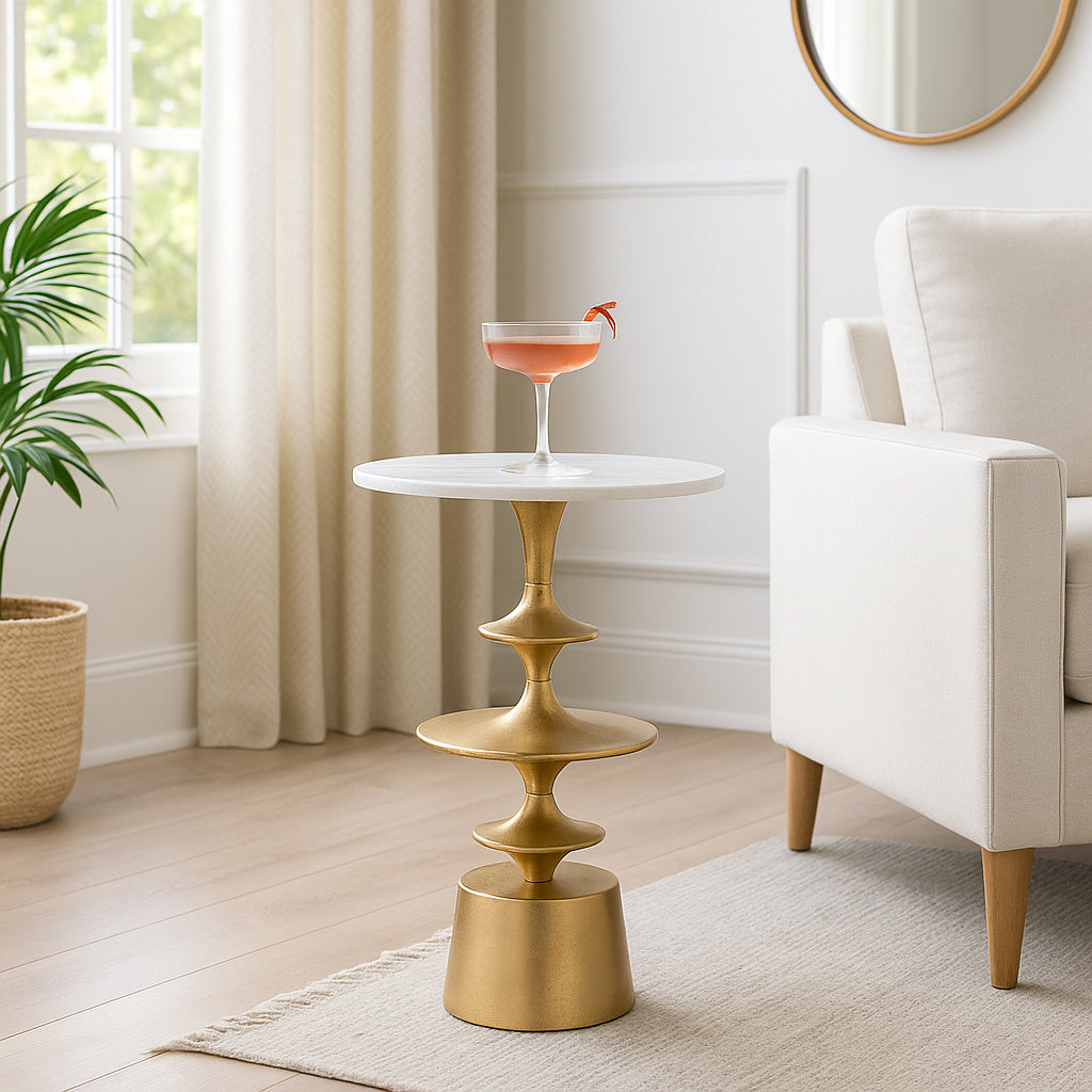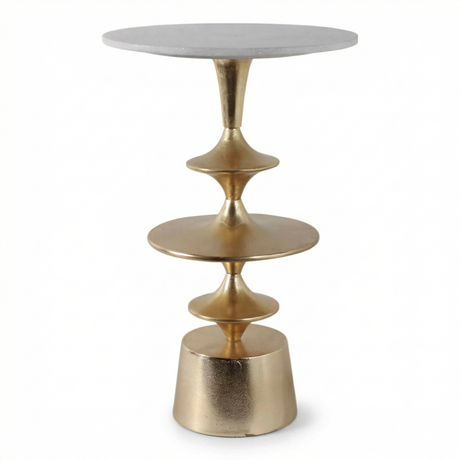 Sculptural stacking meets natural stone. The Discs Base Marble Top Accent Table pairs a pristine white marble top with a gold aluminum base formed of stacked geometric discs. The pedestal delivers visual rhythm and dependable stability without visual clutter. Use it beside a bed for a lamp and book, in a living room to anchor a vignette, or in an entryway for a catch-all surface. The marble offers cool, easy-to-clean durability, while the gold discs catch light throughout the day. Compact enough for tight corners but confident enough to stand alone. Each marble top shows natural variation.