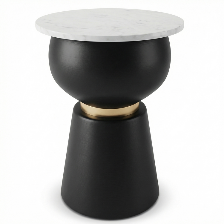 The Lennox pairs a round white marble top with a slim black iron base for a combination that is simple, precise, and hard to date. Each marble slab carries its own subtle veining, so no two tables are identical. The base provides clean visual contrast without competing with the stone above it. At 16.25 inches across and 22 inches tall, it works equally well as a side table beside a sofa, a bedside surface, or a standalone accent in an entryway. A reliable anchor in minimalist, Scandinavian, and industrial interiors alike.