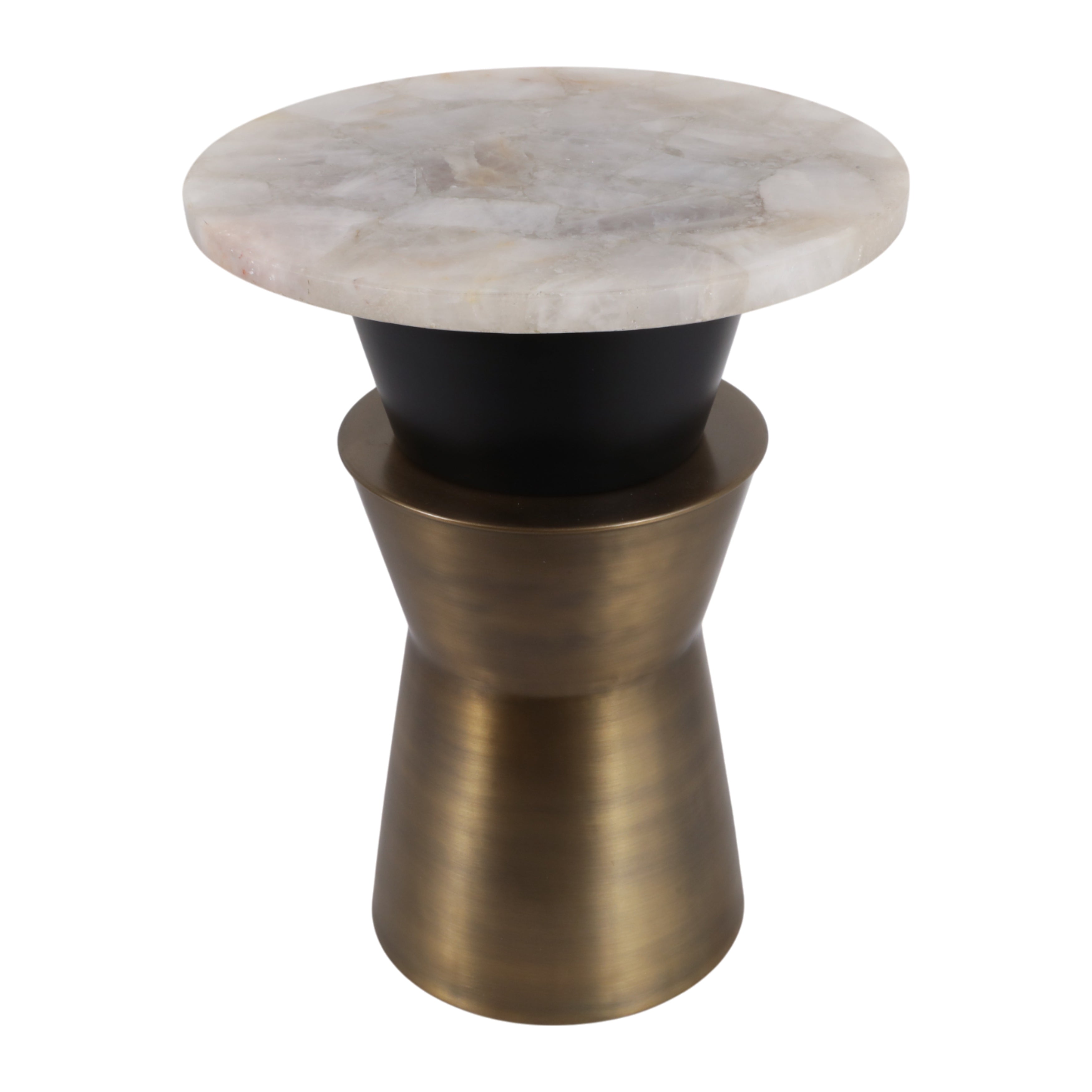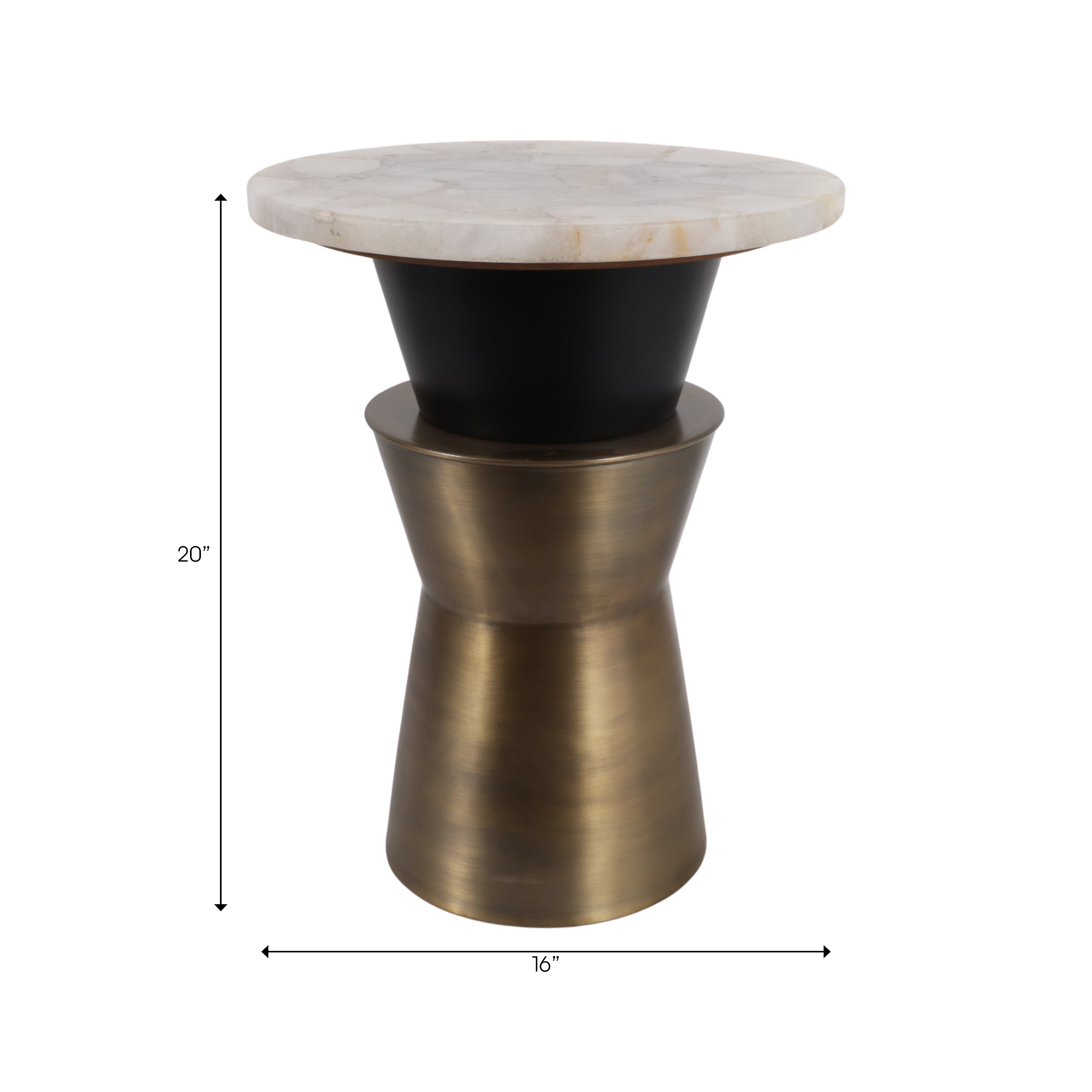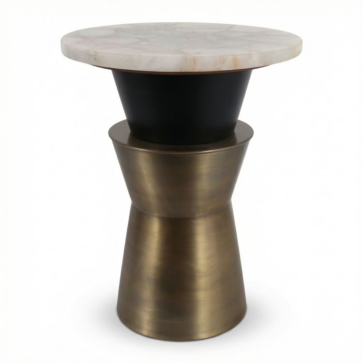 The Onyx Accent Table shares the same sculptural foundation as the Onyx Coffee Table, a brushed antique brass hourglass pedestal with an inverted black iron collar, scaled into a slim, room-friendly side table. The genuine white agate top is polished to reveal natural translucence, soft banding patterns, and subtle crystalline detail that vary in every piece. At 16 inches across and 20 inches tall, it sits beside a sofa, lounge chair, or bed without crowding the space. A natural fit for glam, contemporary eclectic, and bohemian interiors that favor stone and warm metallics.