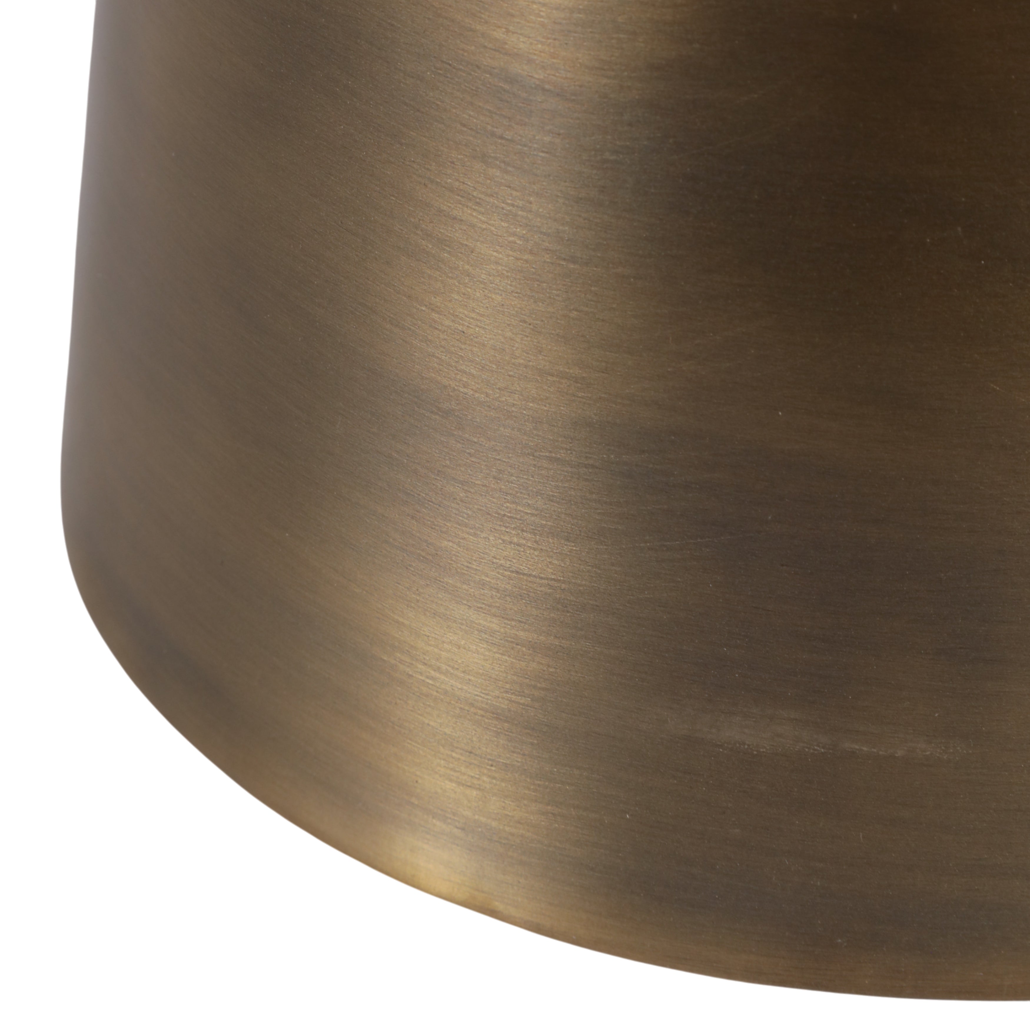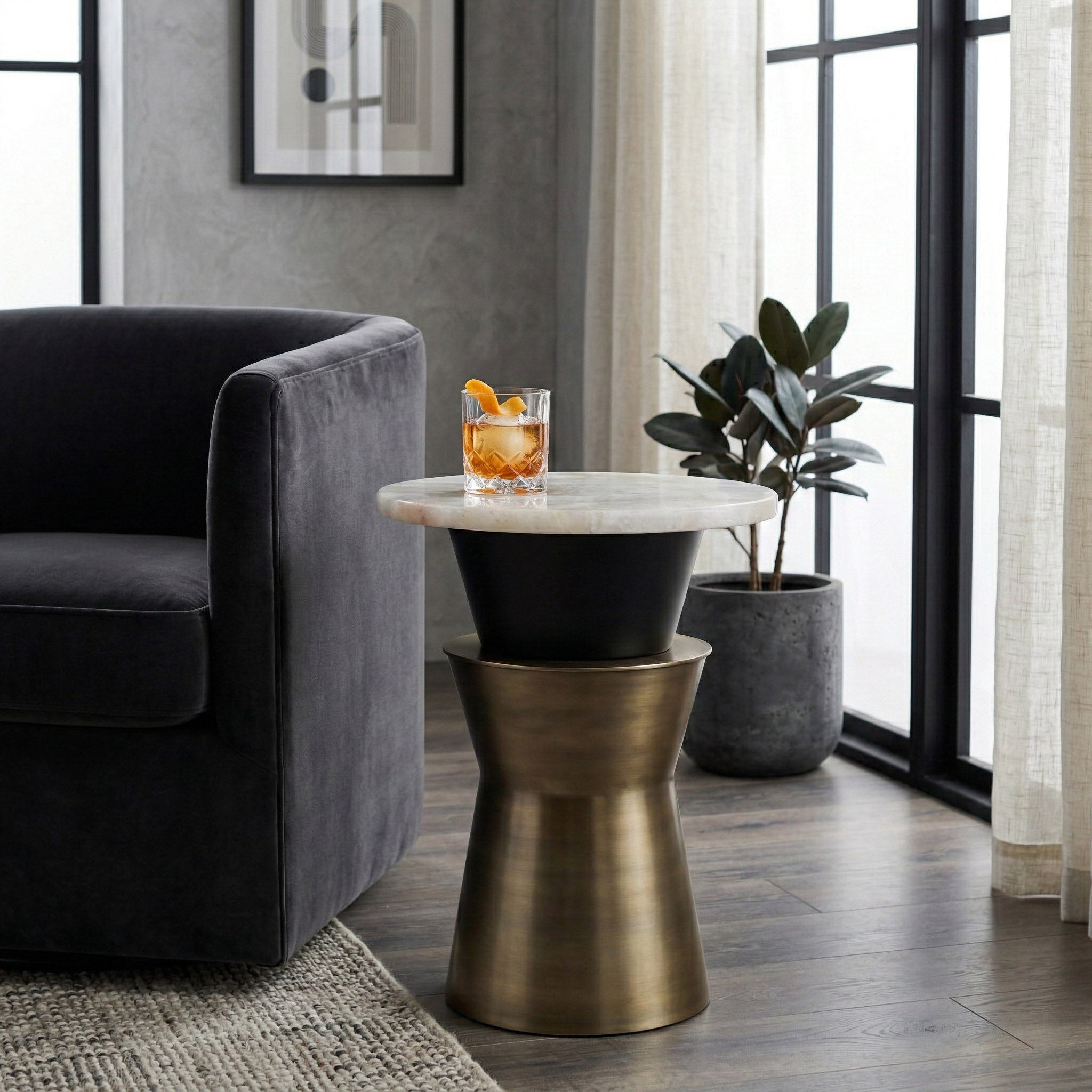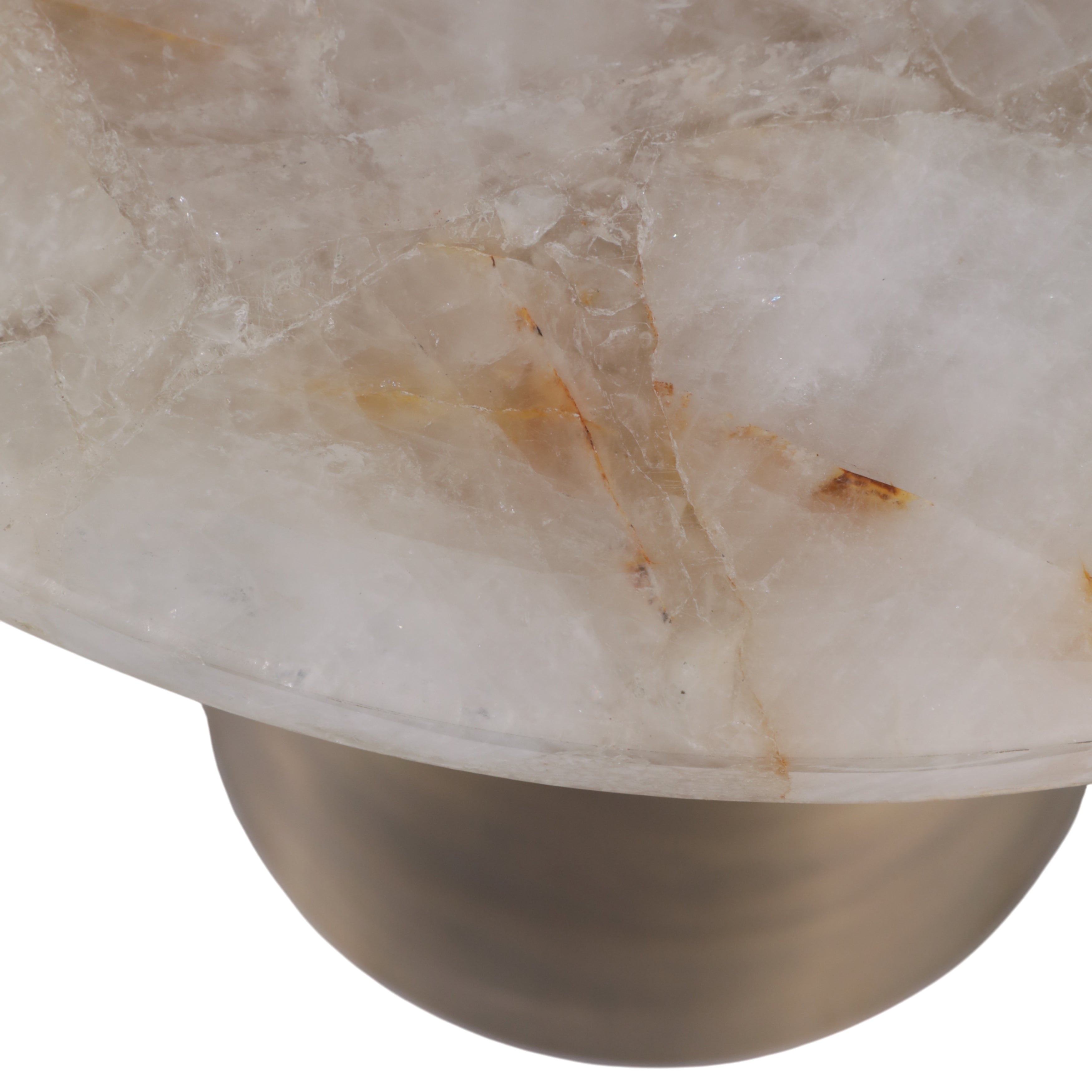 The Onyx Accent Table shares the same sculptural foundation as the Onyx Coffee Table, a brushed antique brass hourglass pedestal with an inverted black iron collar, scaled into a slim, room-friendly side table. The genuine white agate top is polished to reveal natural translucence, soft banding patterns, and subtle crystalline detail that vary in every piece. At 16 inches across and 20 inches tall, it sits beside a sofa, lounge chair, or bed without crowding the space. A natural fit for glam, contemporary eclectic, and bohemian interiors that favor stone and warm metallics.