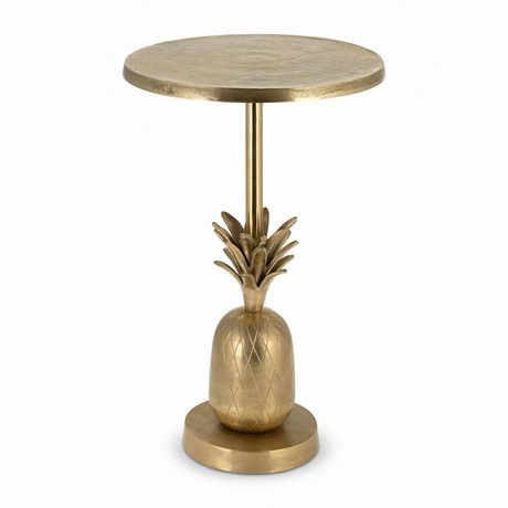 The Pineapple Side Table commits fully to its form, a life-size metallic pineapple rendered in warm gold as a sculptural base with a flat top that keeps the design grounded and functional. It brings an assured sense of personality to a living room corner, entryway console grouping, or bedside. At 24 inches tall and just under 10 inches wide, the slim profile lets it occupy a small footprint without shrinking its presence. For interiors that take design seriously but don't take themselves too seriously.