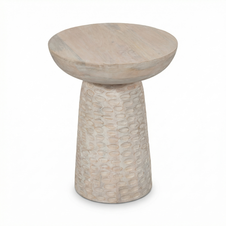 The White Wash Wood Accent Table brings quiet, organic character to a compact form, its all-wood construction finished in a soft white wash that lets the natural grain and hammered base texture remain visible beneath the surface. The tactile base adds handcrafted depth without demanding attention, keeping the overall feel relaxed and considered. At 16 by 16 inches and 20 inches tall, it sits comfortably beside an armchair, sofa, or bed. A natural complement to coastal, Scandinavian, and relaxed organic interiors.