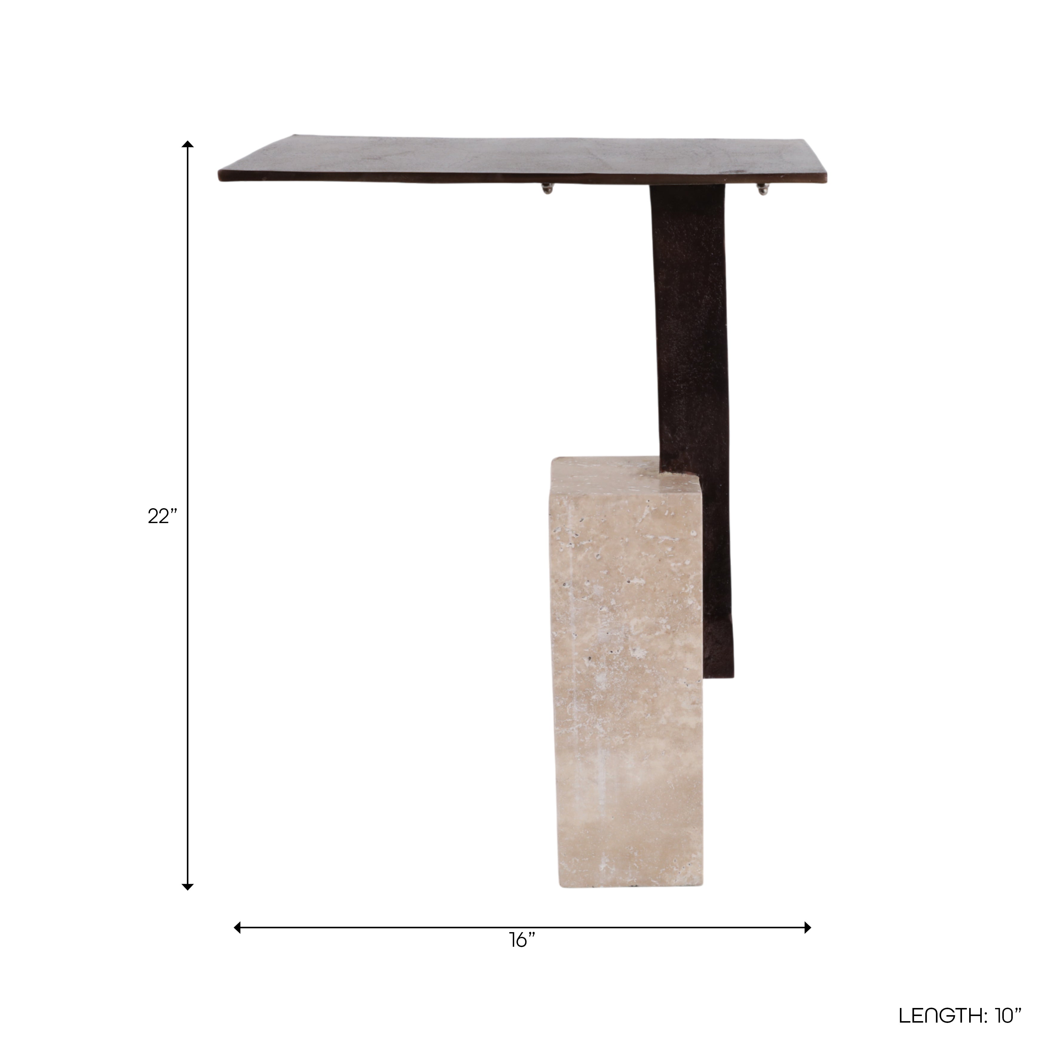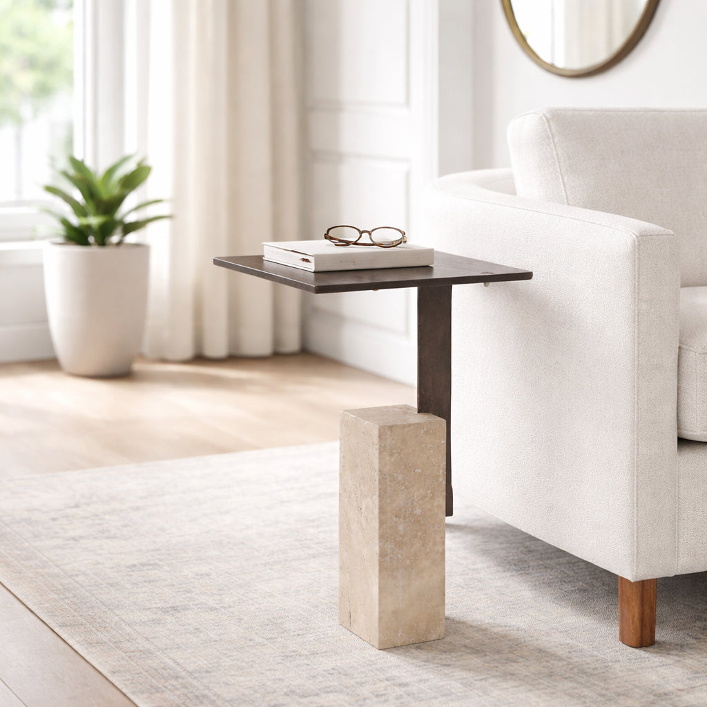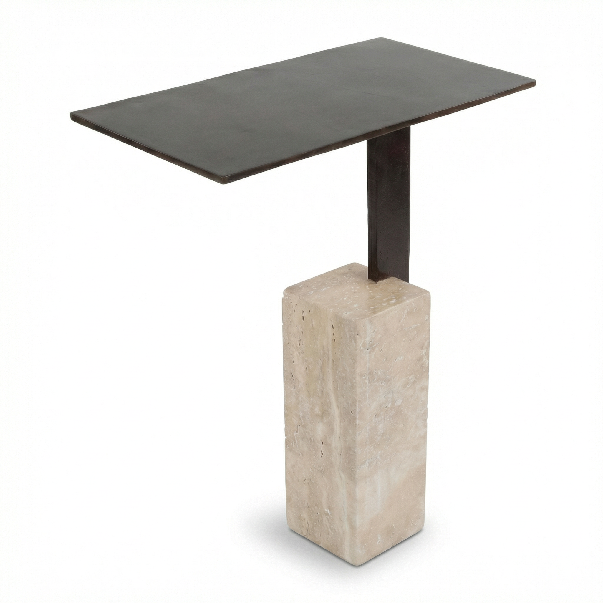 The Zulik is built around a single architectural idea: a slim bronze stem rising from a solid travertine block to carry a cantilevered rectangular top. The travertine base brings the stone's characteristic pitted surface, cream-to-beige tones, and natural veining, with variation in every piece that cannot be replicated. The bronze-finished aluminum top and stem add industrial precision that sits in sharp contrast to the raw stone below. A strong fit for living rooms or bedrooms where the furniture is expected to hold its own as an object.