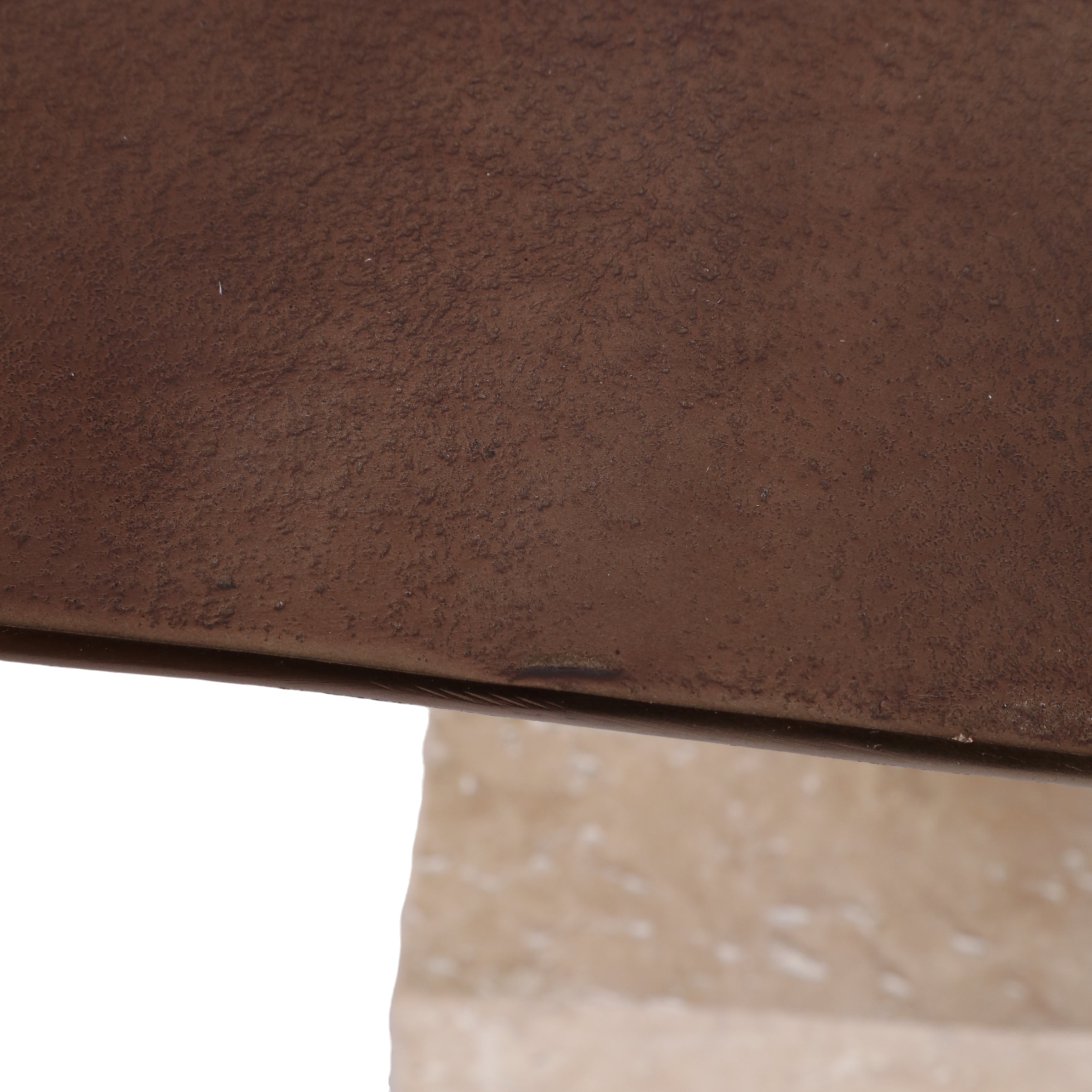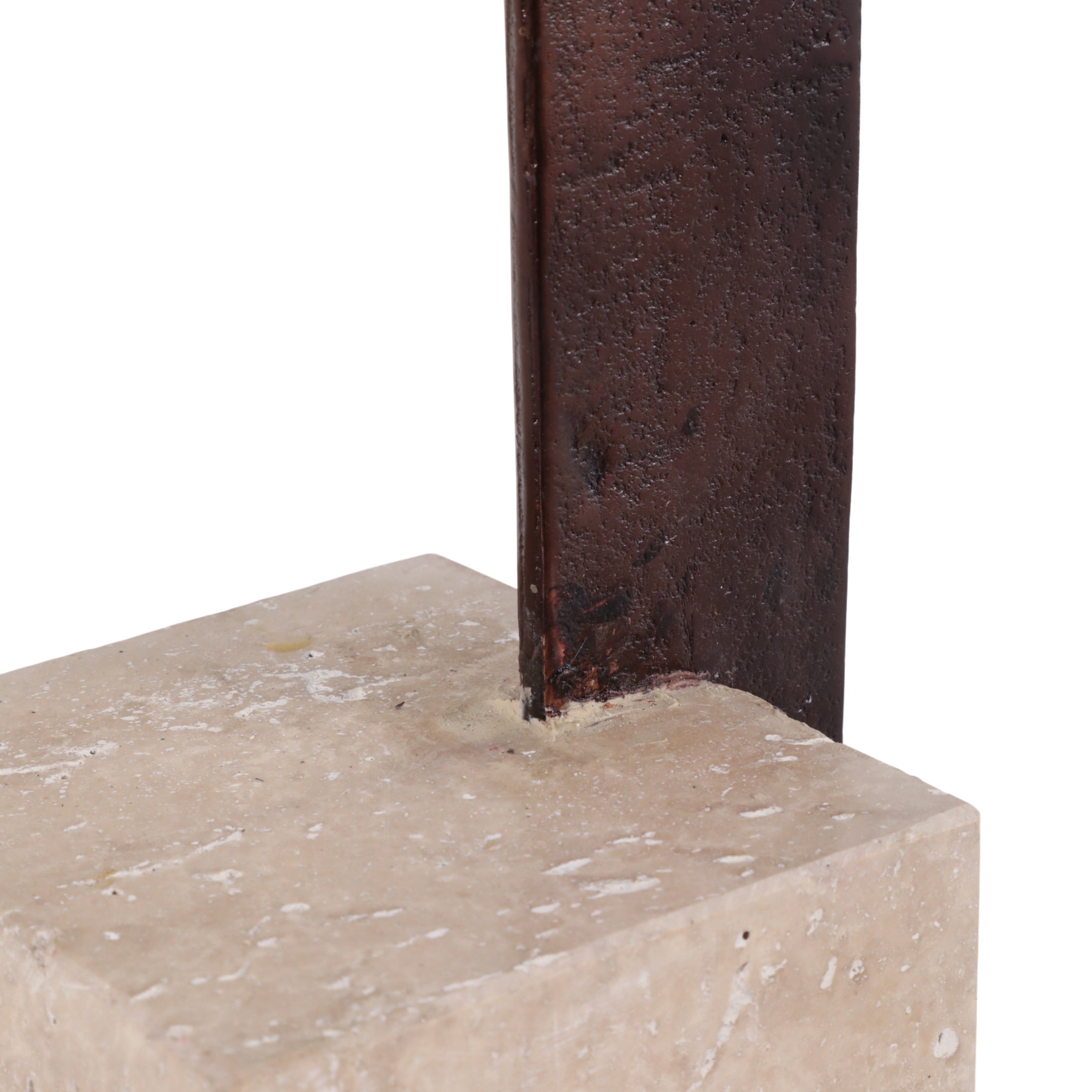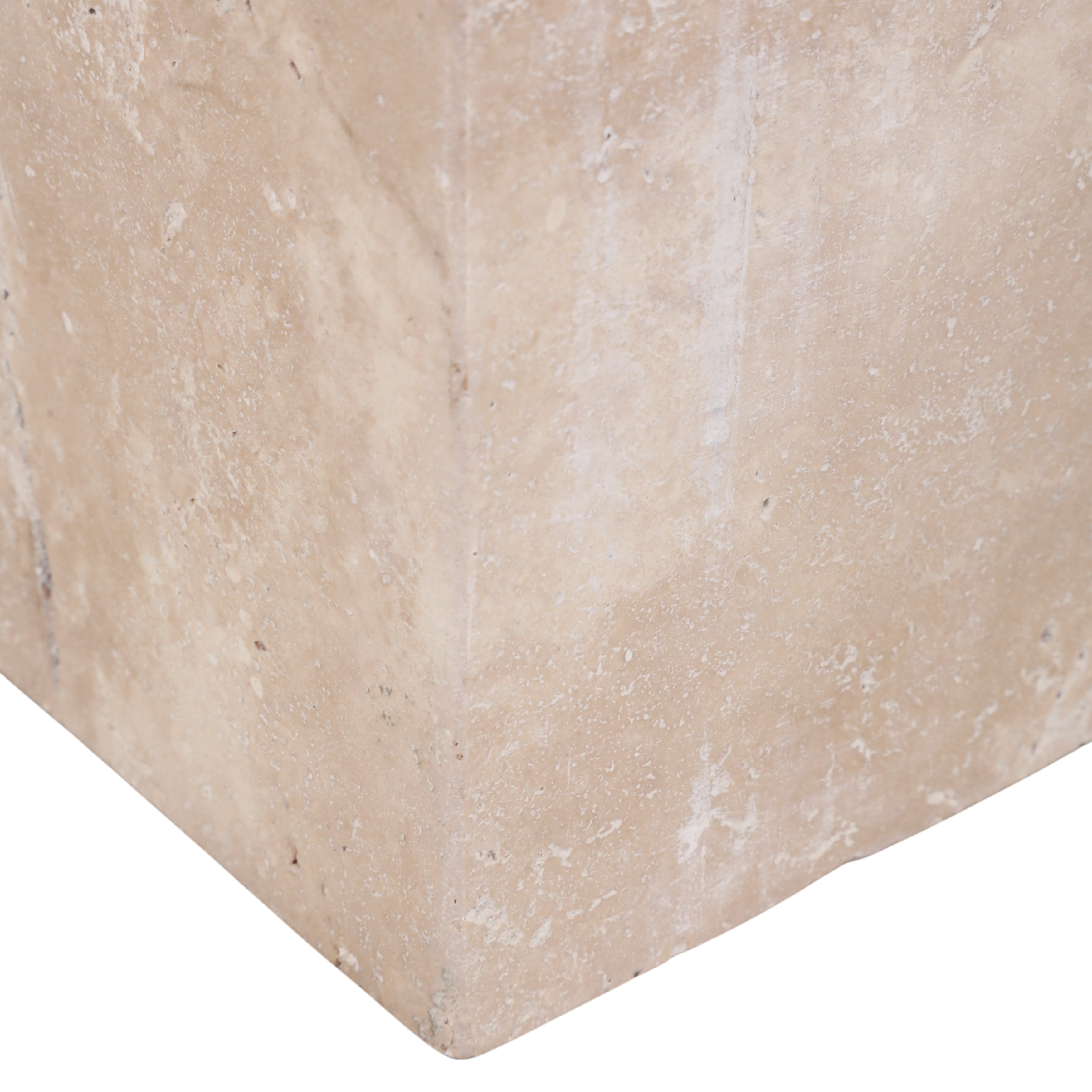 The Zulik is built around a single architectural idea: a slim bronze stem rising from a solid travertine block to carry a cantilevered rectangular top. The travertine base brings the stone's characteristic pitted surface, cream-to-beige tones, and natural veining, with variation in every piece that cannot be replicated. The bronze-finished aluminum top and stem add industrial precision that sits in sharp contrast to the raw stone below. A strong fit for living rooms or bedrooms where the furniture is expected to hold its own as an object.