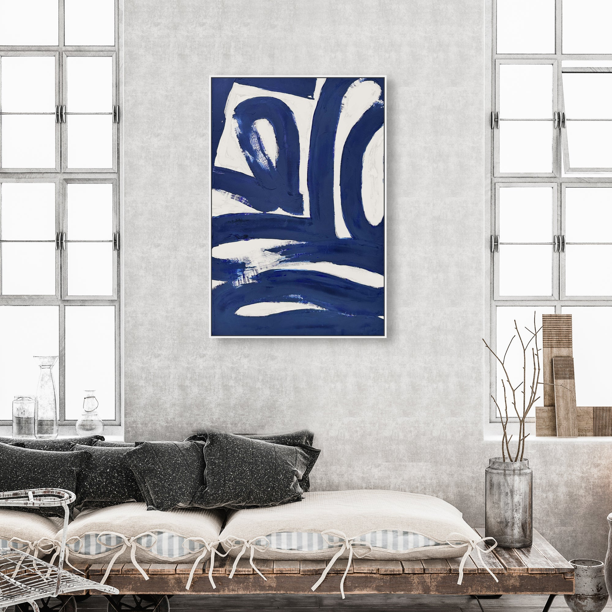 Rich indigo forms emerge from a luminous ground, their confident geometry softened by impasto layering that invites tactile engagement. This abstract work distills minimalism to its essence—restraint paired with visual intensity. The hand-applied texture creates dimensional complexity, revealing new subtleties as light shifts across the surface. Conceived for the thoughtful collector, this piece transcends decorative function to become a meditative object. Its exclusive provenance and sophisticated restraint signal a commitment to artistic substance over aesthetic convenience. A work that rewards sustained attention.
