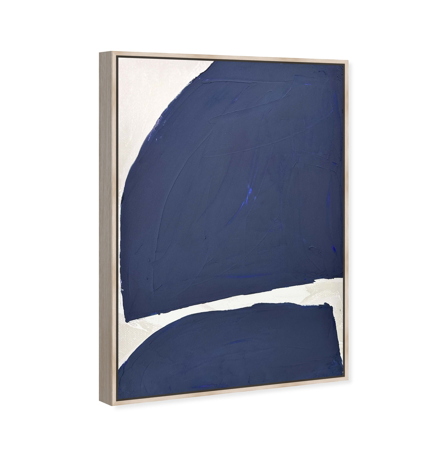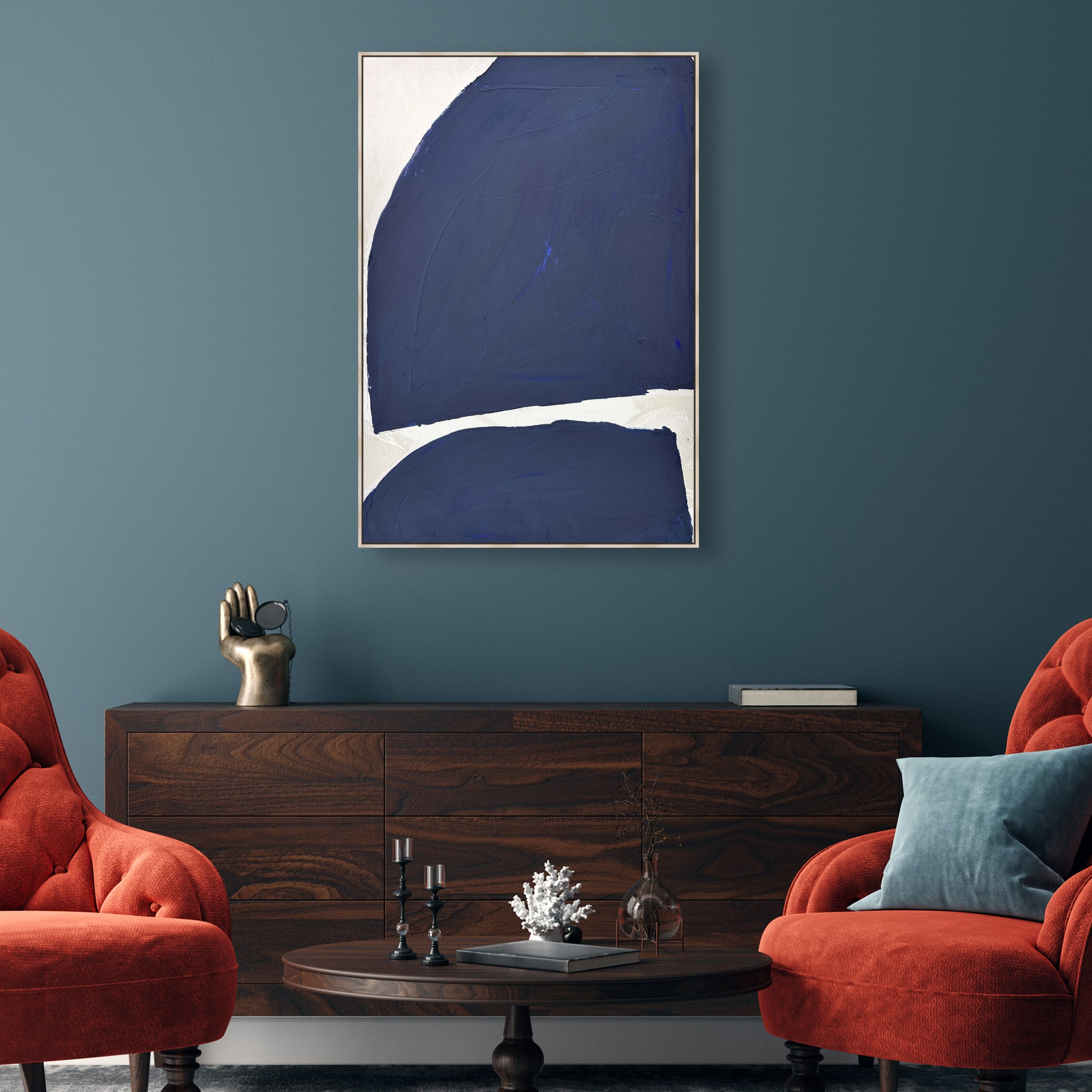 This contemporary abstract work masterfully balances visual intensity with restrained aesthetics. Deep indigo forms emerge against a luminous ground, their sculptural presence amplified by meticulously layered impasto application. The hand-embellished surface creates tangible depth—each textured stroke catches light differently, revealing new dimensions upon closer inspection. Rather than pursuing minimalism through reduction alone, this piece achieves it through purposeful restraint paired with sophisticated material technique. The result is a composition that commands presence without demanding loudness, offering the kind of refined visual impact that resonates with serious collectors. A statement piece for those who understand that true elegance lies in the marriage of bold artistic vision and disciplined execution.