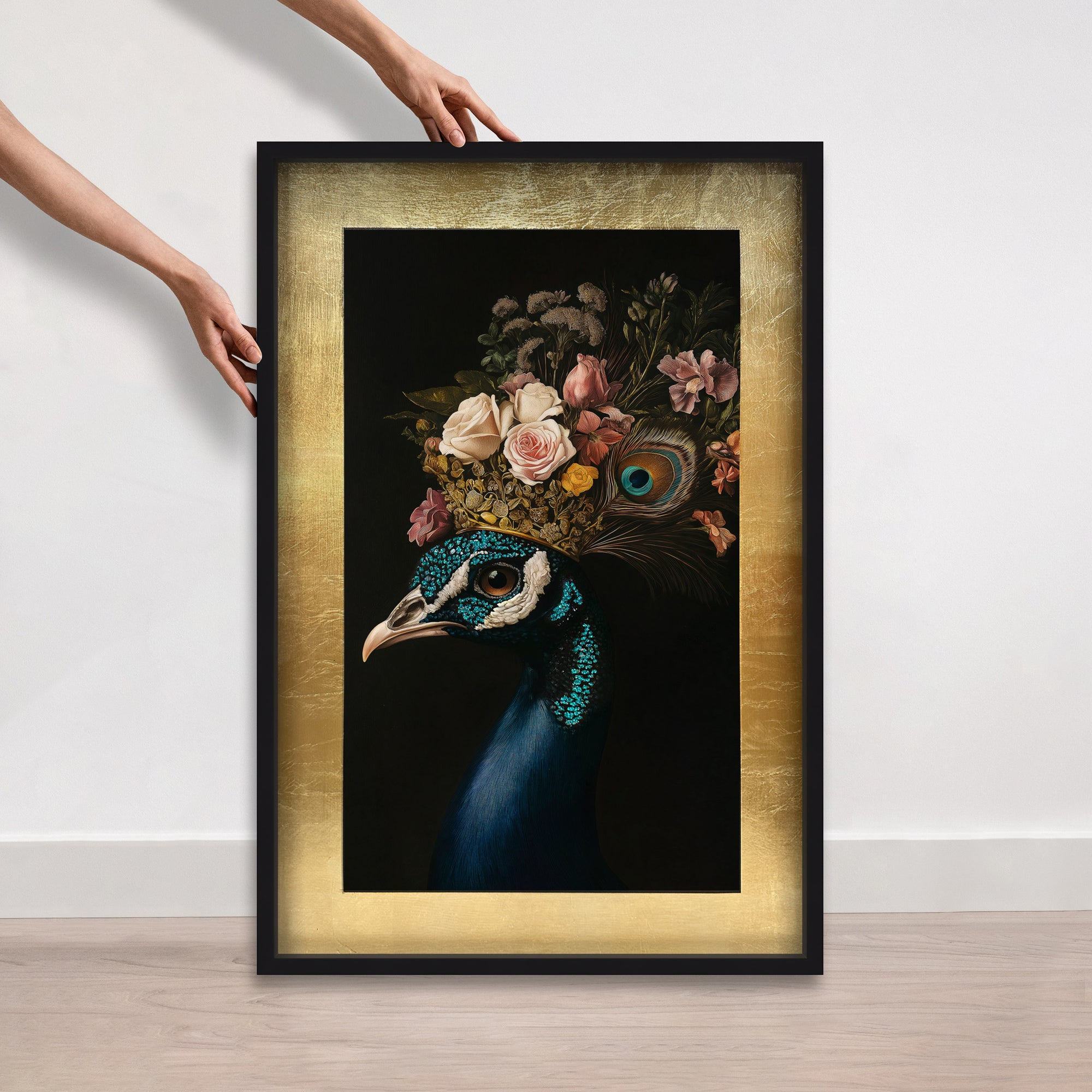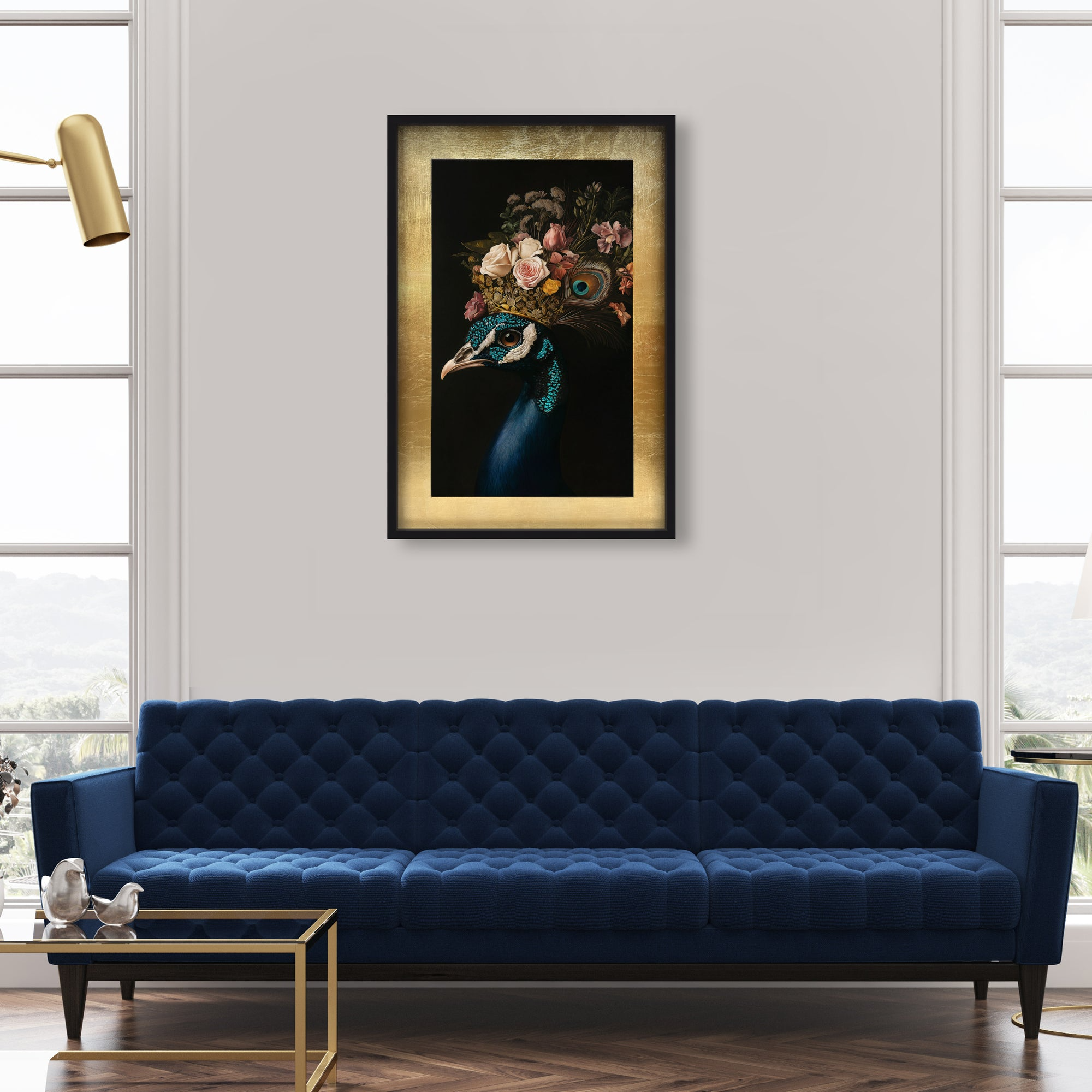 Peacock's Crown II showcases a peacock adorned in magnificent Versailles-inspired splendor. This artwork blends the richness of hand-painted florals with vibrant jewel-toned feathers, crowned by a radiant gold finish. Enhanced with meticulously applied gold leaf and delicate glitter details, it offers a sophisticated tribute to regal elegance—perfect for spaces that command attention. It features hand-applied gold leaf to add depth and shimmering black and teal glitter for a refined, luxurious effect. Ideal when paired with lush velvets or deep, floral hues to elevate the ambiance.