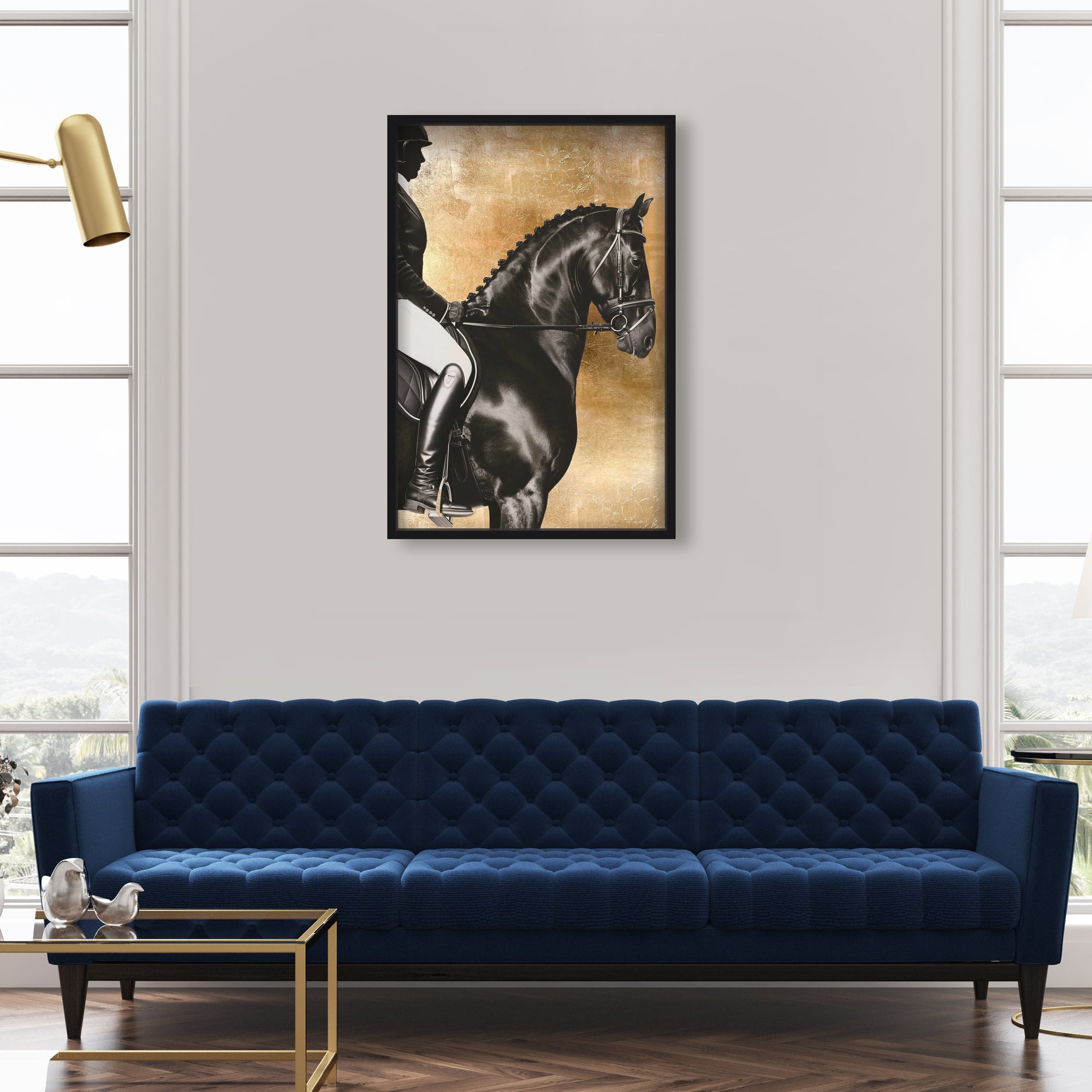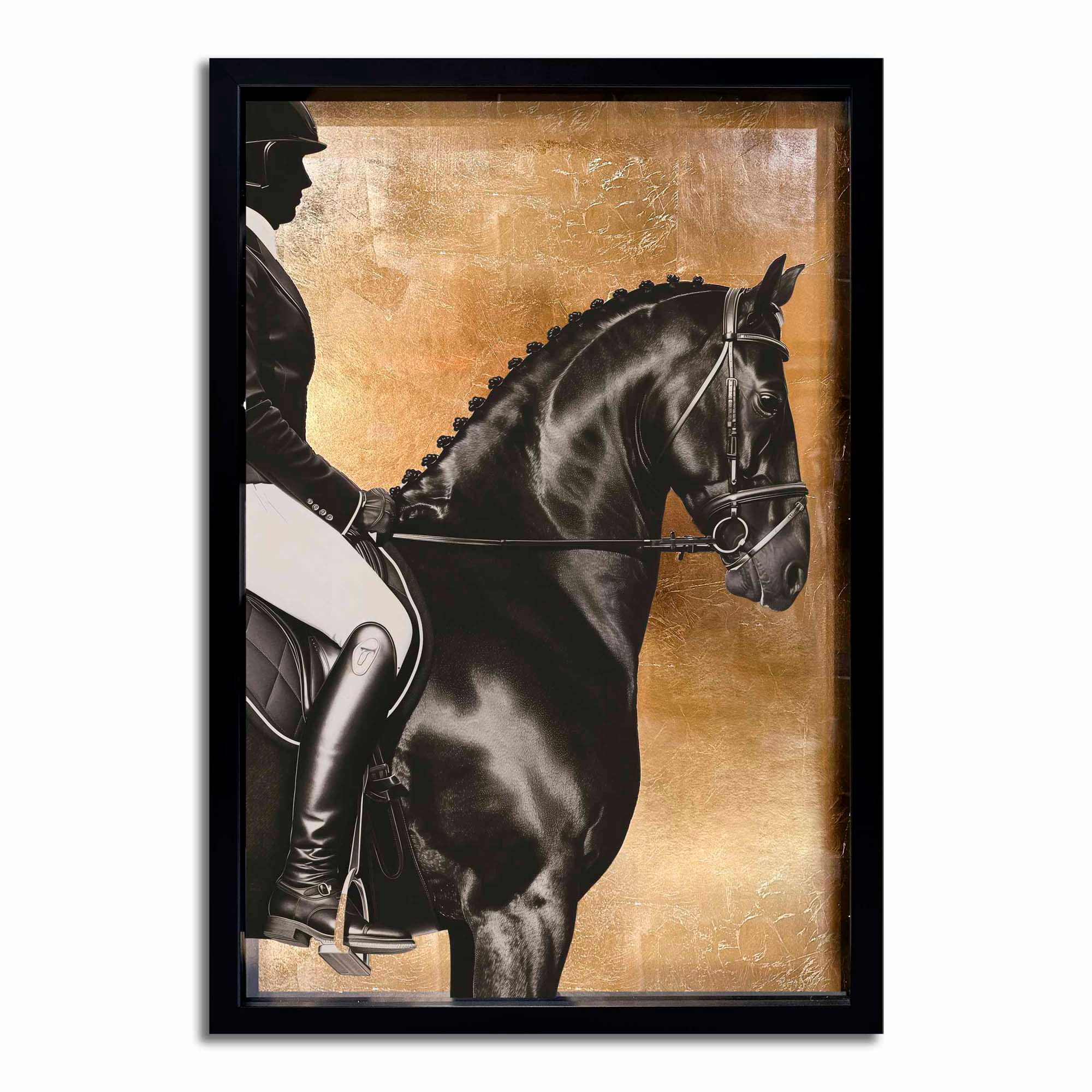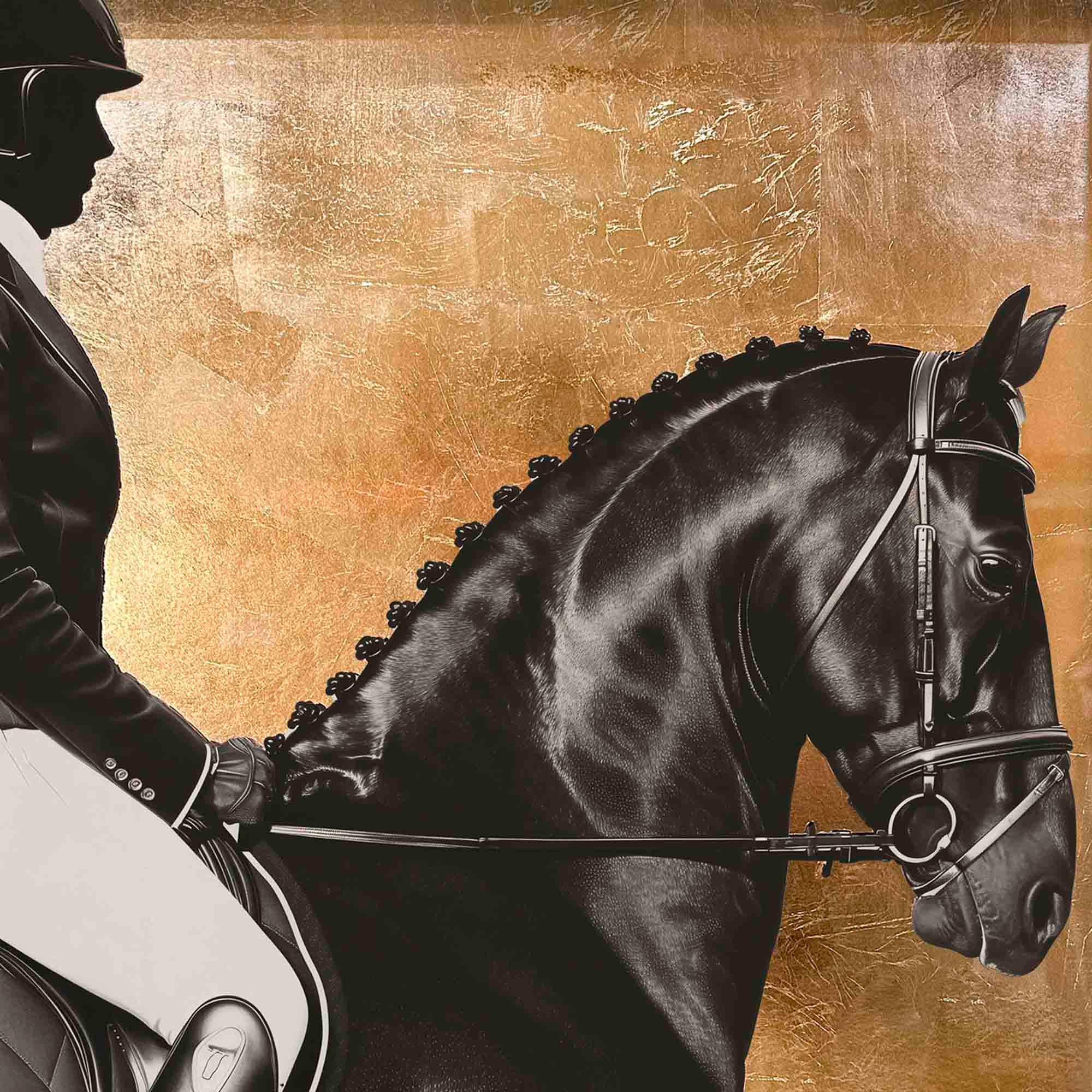 Experience luxury in motion with this striking artwork that portrays the poised strength of a rider and their horse against a hand-applied gold leaf backdrop. The sophisticated interplay of matte black and white offers a contemporary take on classic equestrian elegance. Thoughtfully designed, it complements refined, stately interiors and adds both structure and warmth to offices, studies, or foyers. Part of the Brexton Cole capsule celebrating equine majesty, this piece brings timeless style and grace to any space.