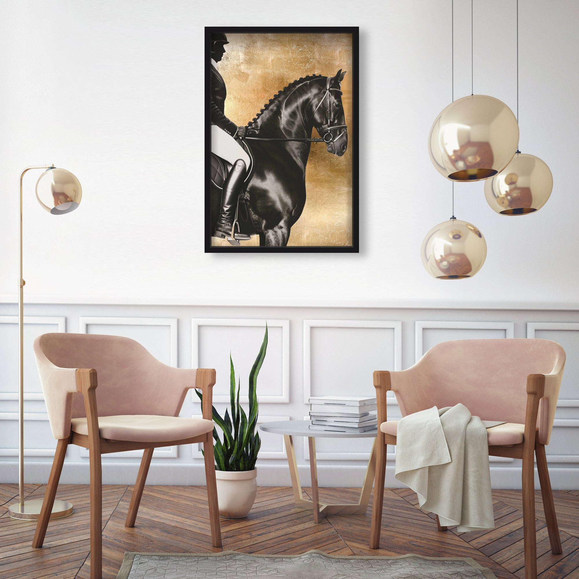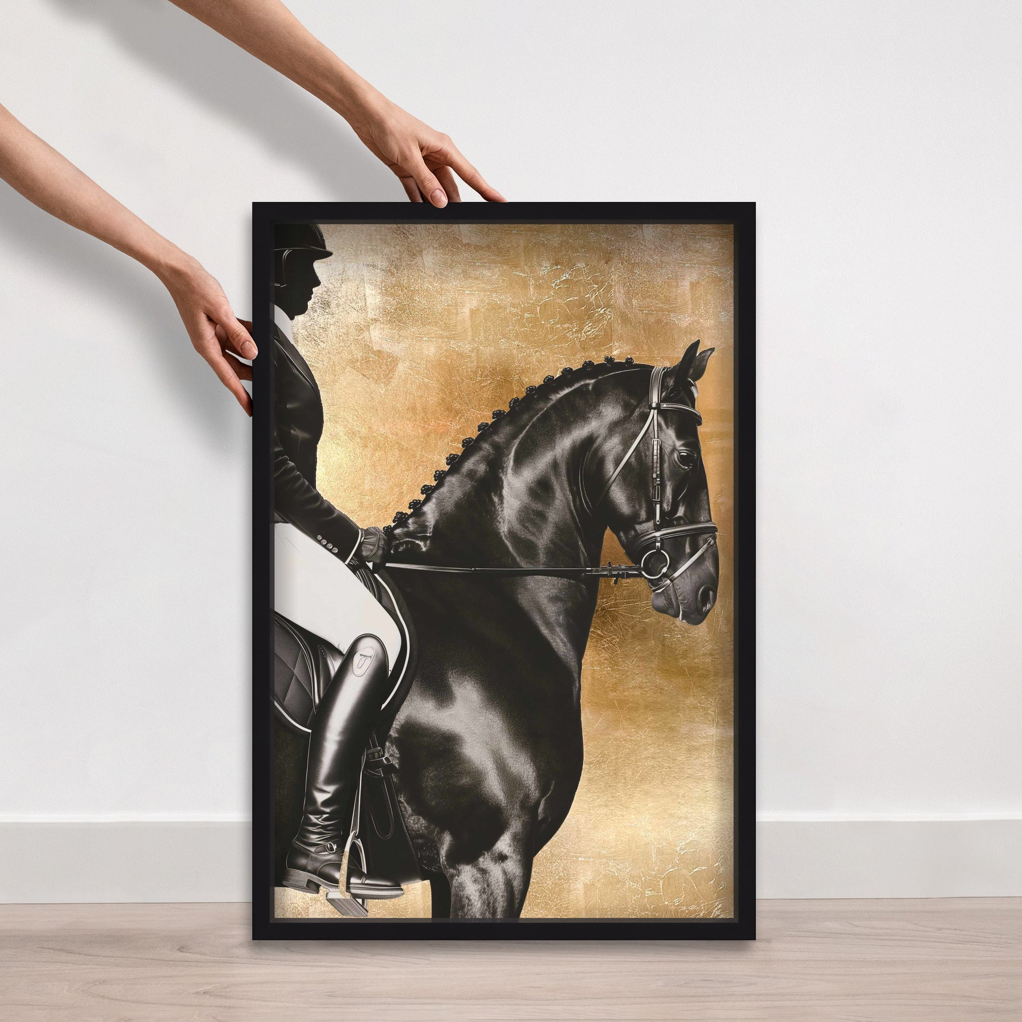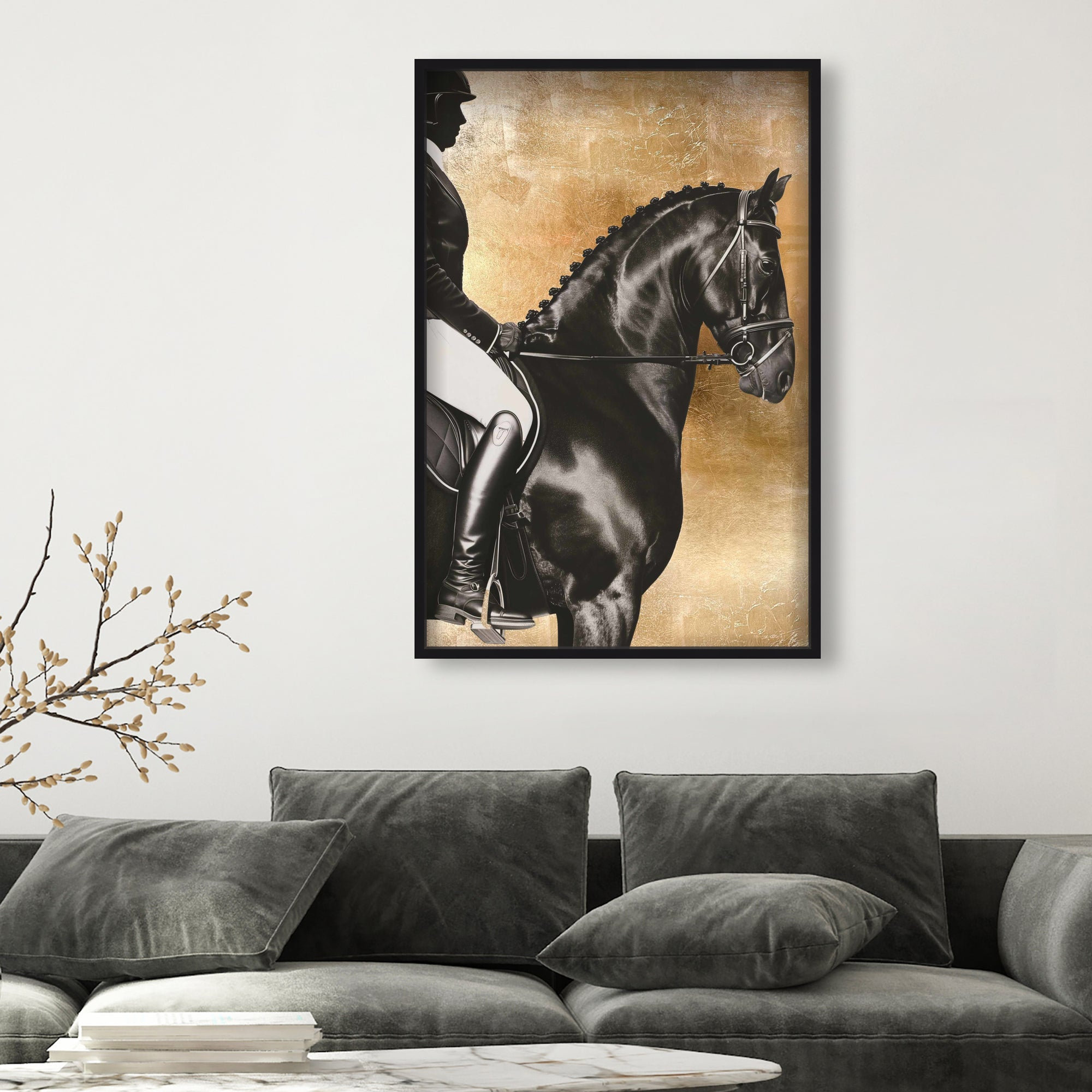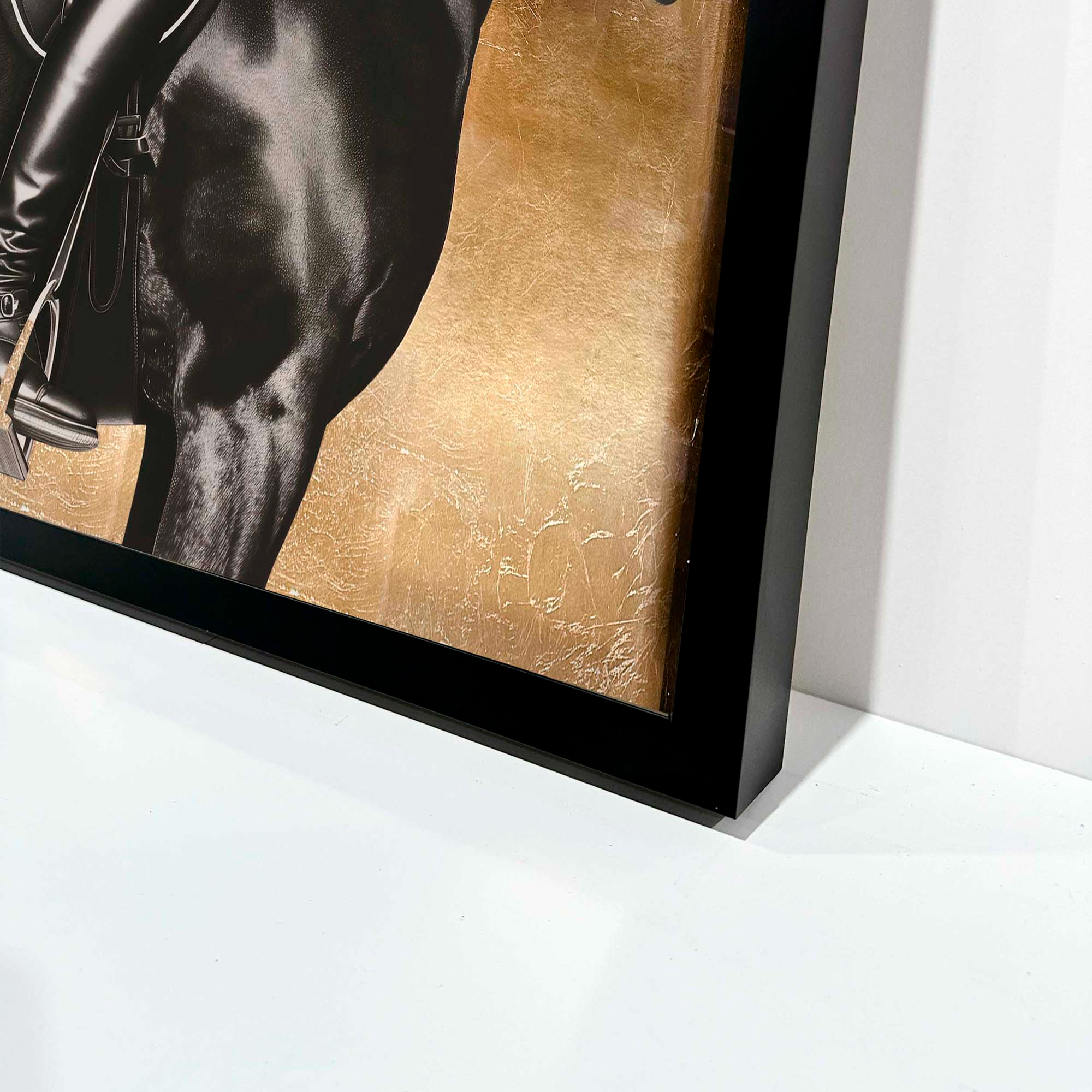 Experience luxury in motion with this striking artwork that portrays the poised strength of a rider and their horse against a hand-applied gold leaf backdrop. The sophisticated interplay of matte black and white offers a contemporary take on classic equestrian elegance. Thoughtfully designed, it complements refined, stately interiors and adds both structure and warmth to offices, studies, or foyers. Part of the Brexton Cole capsule celebrating equine majesty, this piece brings timeless style and grace to any space.