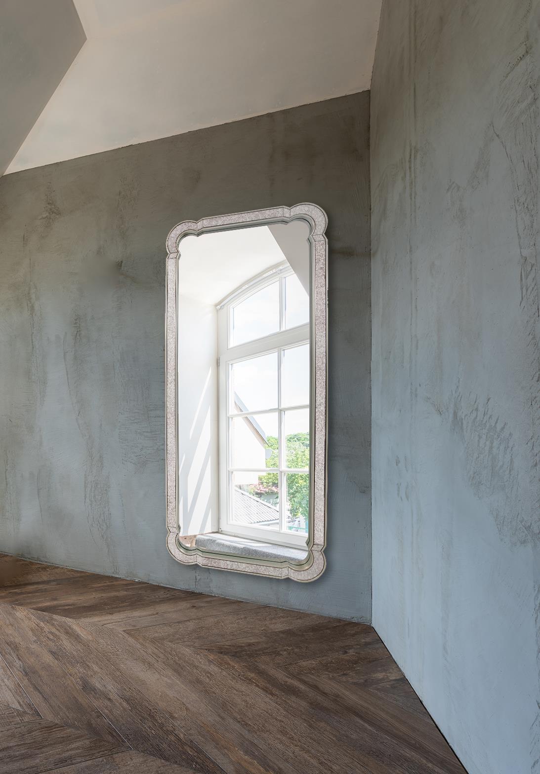 • Old-World Craft, Modern Scale: Exquisite silver leaf and antique mirror details meet a generously proportioned, contemporary shape.