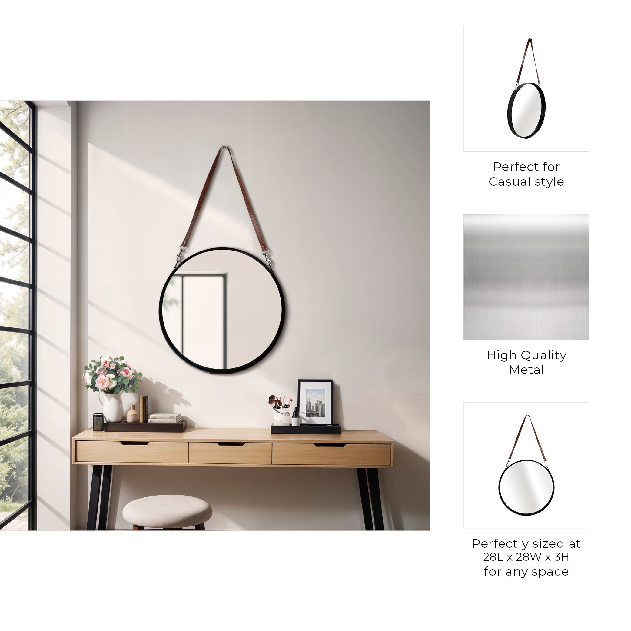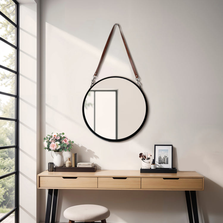 Classic 28" round wall mirror with strap design