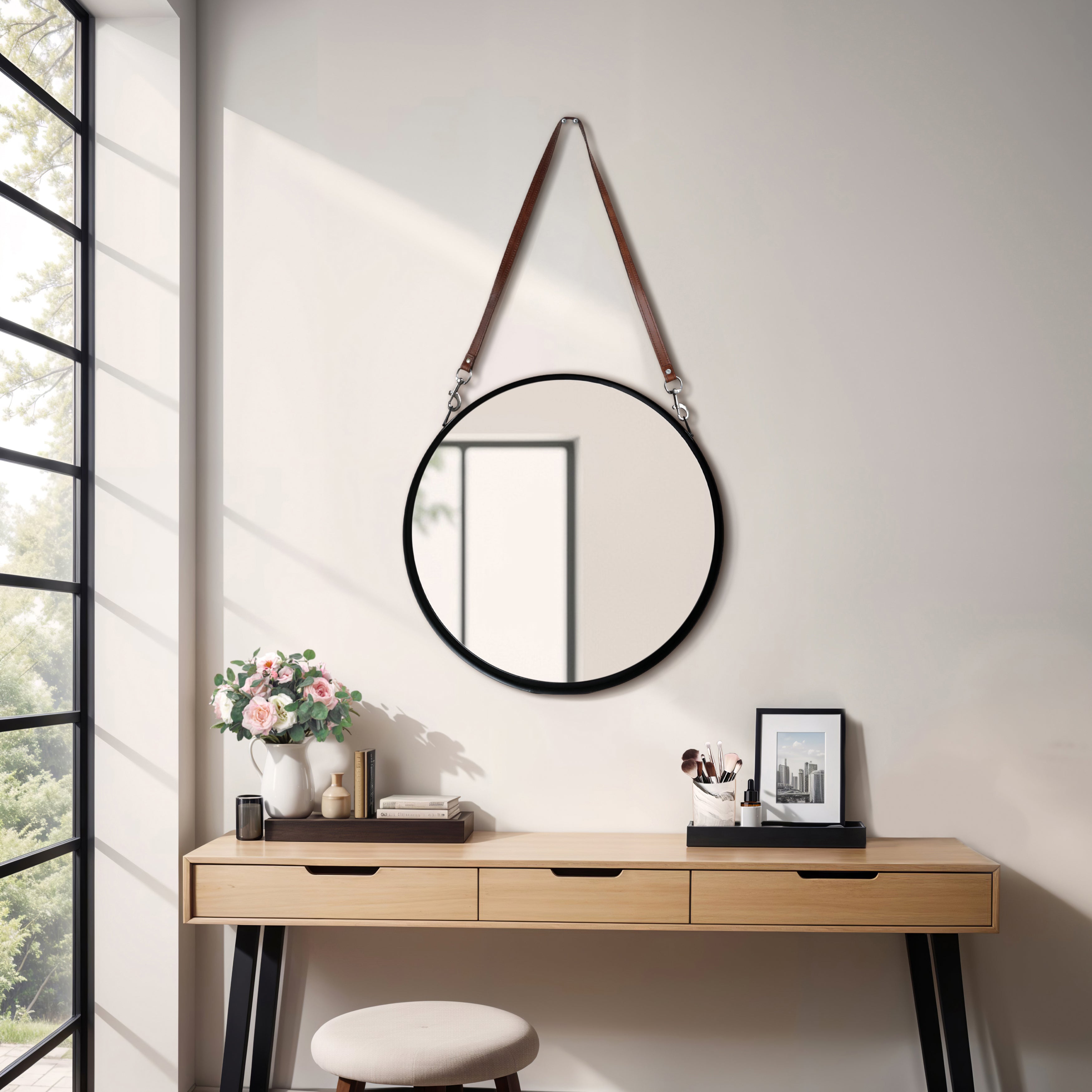 Round Leather Strap Wall Mirror