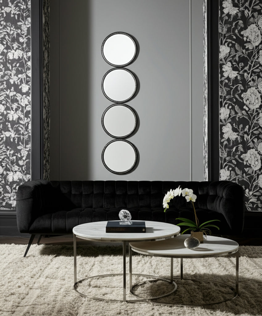 Bring a touch of modern elegance to your walls with the 4 Circles Statement Wall Mirror. Featuring four connected circular mirrors in a sleek black finish, this piece adds depth, light, and style to any room. Perfect for entryways, living spaces, or hallways, it’s both functional and decorative.