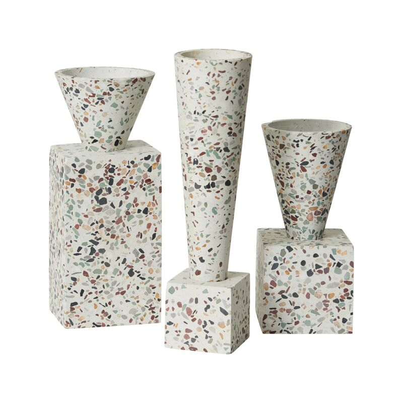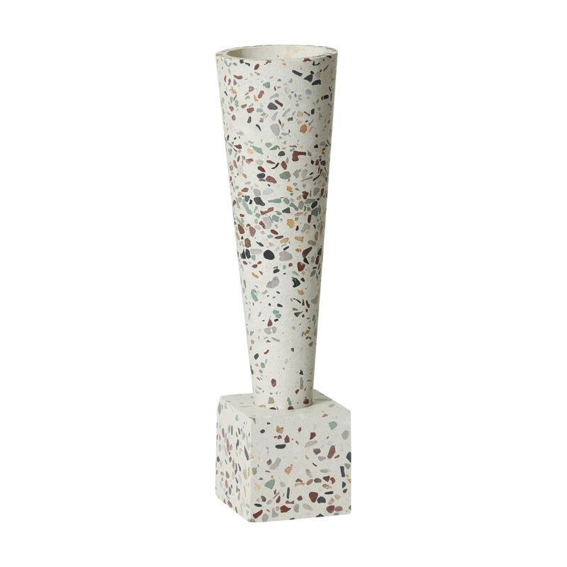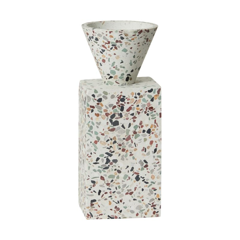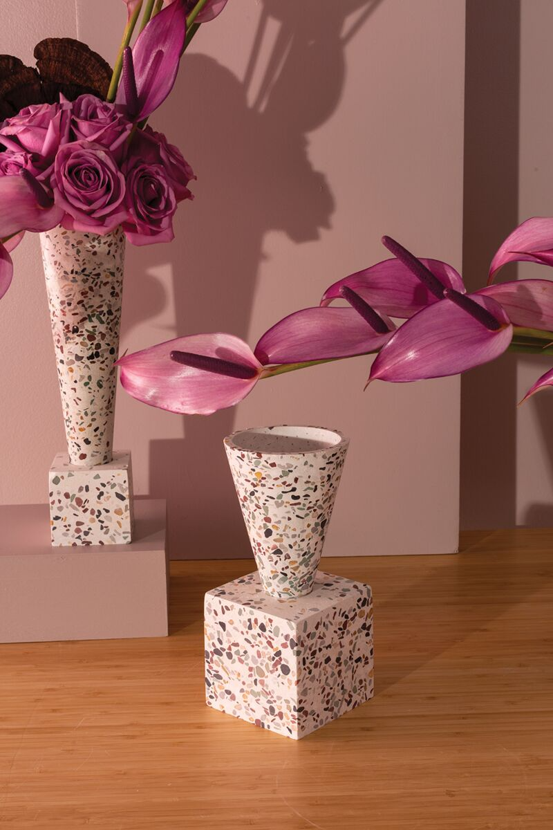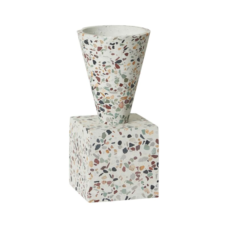 The Terrazzo Vase also boasts a unique geometric base and cone shaped vase. Designed to be used as a small vase or planter, the Terrazzo Vase also fits a 2.5” drop in pot for all your designing needs.