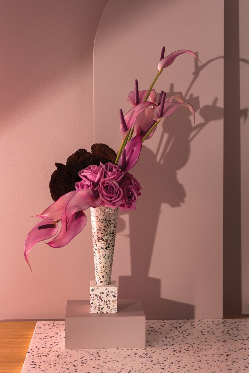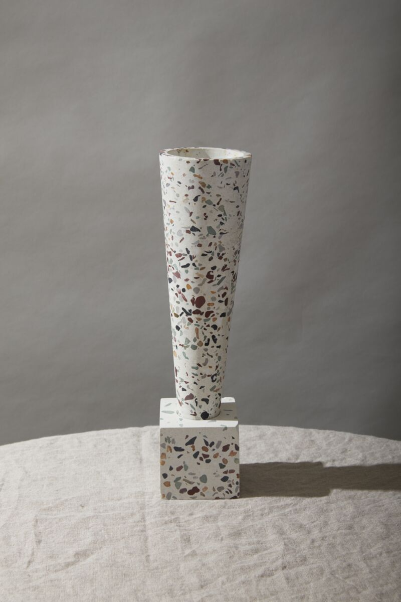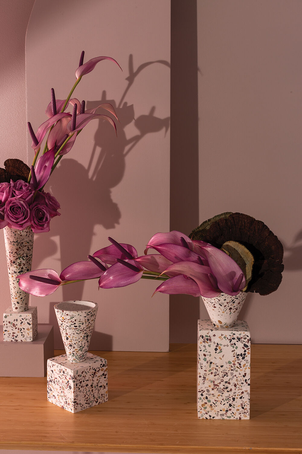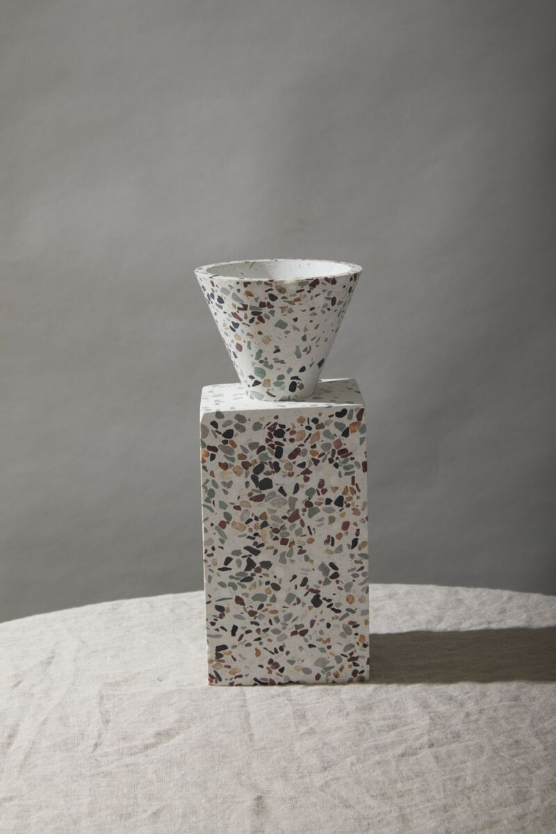 The Terrazzo Vase also boasts a unique geometric base and cone shaped vase. Designed to be used as a small vase or planter, the Terrazzo Vase also fits a 2.5” drop in pot for all your designing needs.
