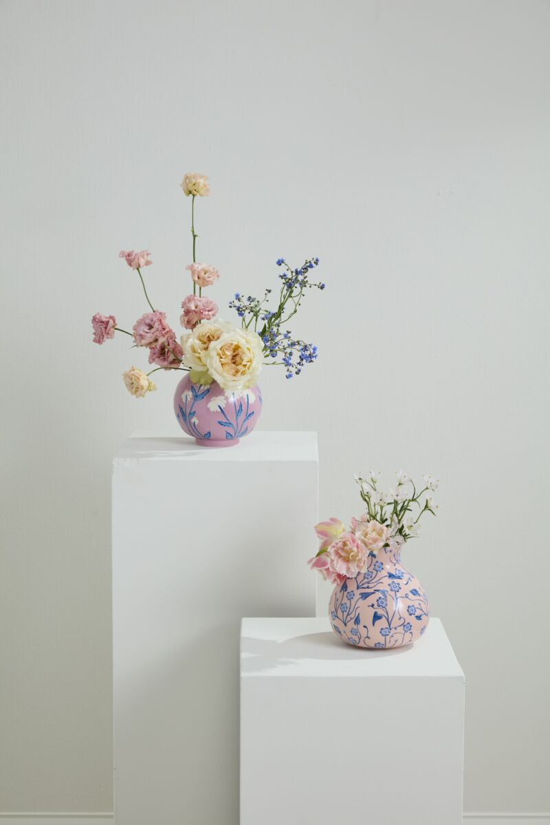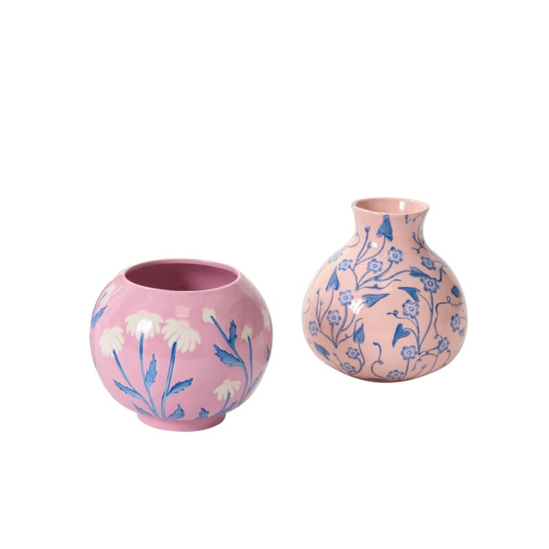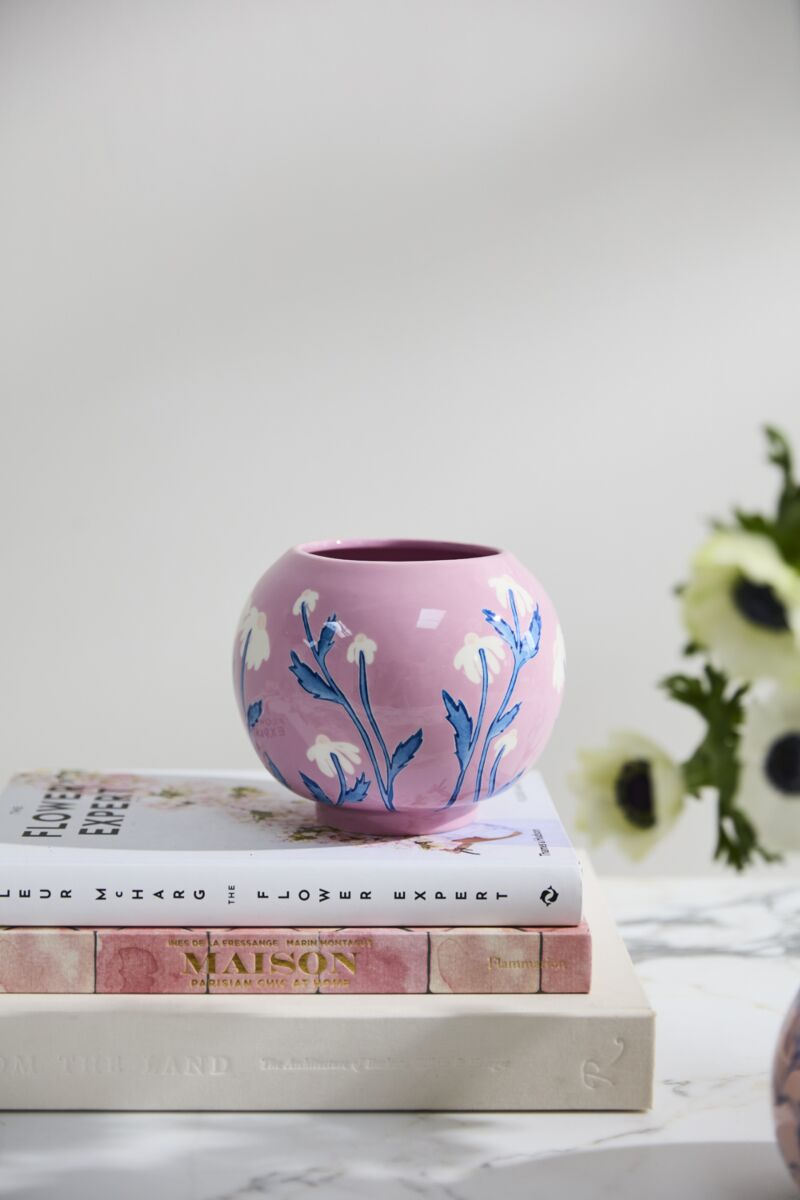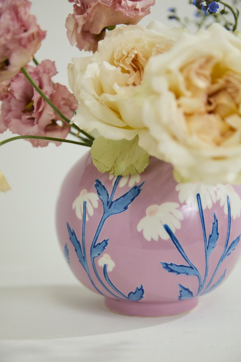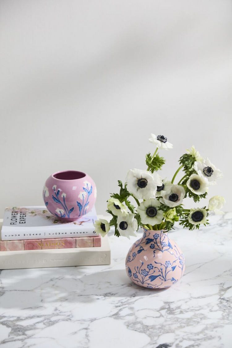 The Blushing Bloom Vase features hand-painted white flowers and slender blue stems on a glossy pinkish-purple ceramic base, embodying classic elegance. This refined piece can stand alone as a decorative accent or elevate simple floral displays, making it an ideal gift for Mother's Day or birthdays. Its tasteful design brings enduring sophistication to any setting.