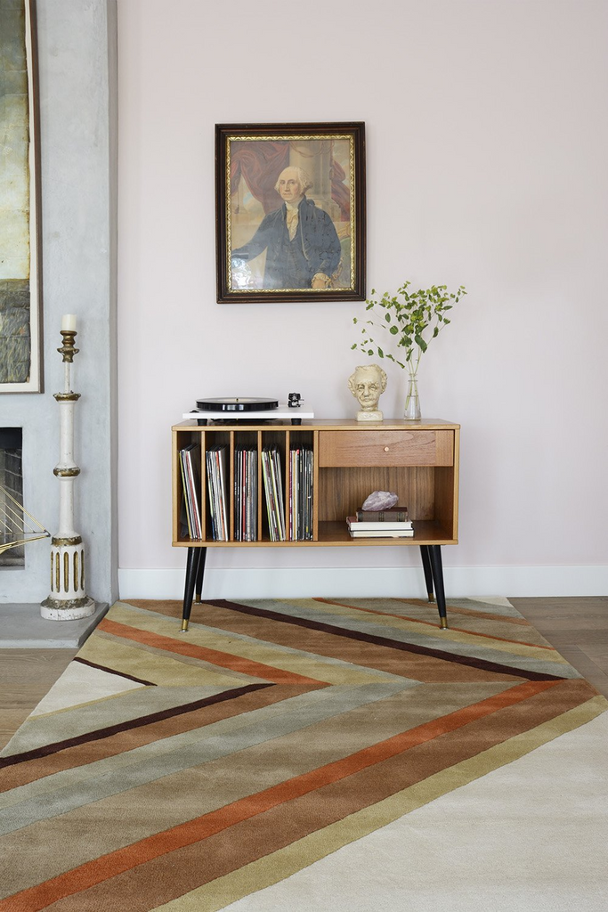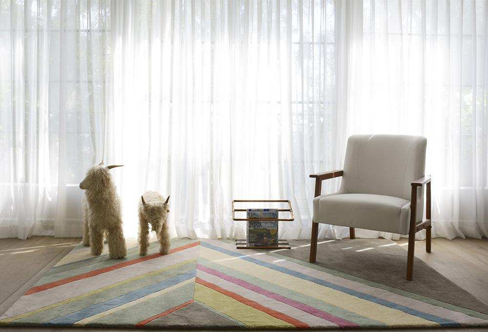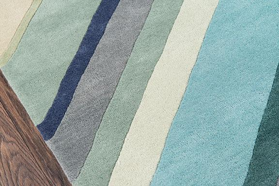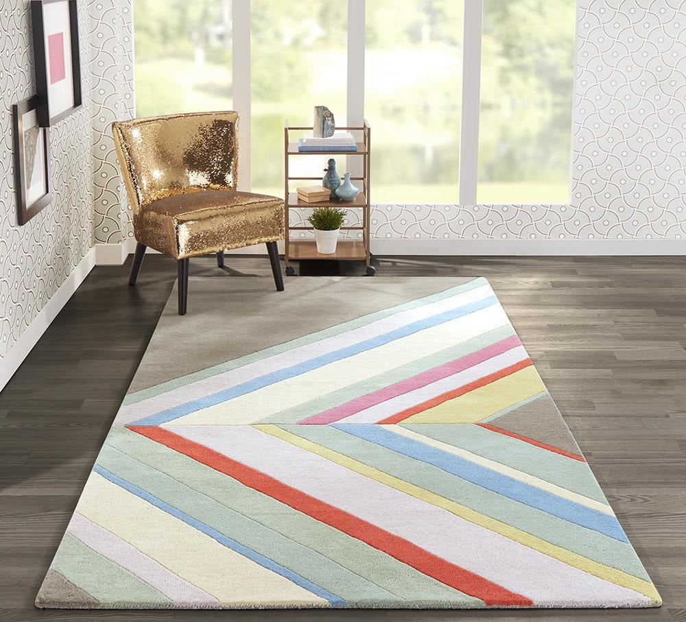 The graphic design of this modern area rug collection adds contemporary flair to floors throughout the home. Captured in a spectrum of vivid shades, polka dots, chevron stripes, triangulated patterns and checkerboard prints are perfect for layering above carpet or hard surfaces. Hand tufted from natural wool fibers, this decorative area rug assortment emanates fun with its oversized geometric arrangements and vibrant splashes of color.