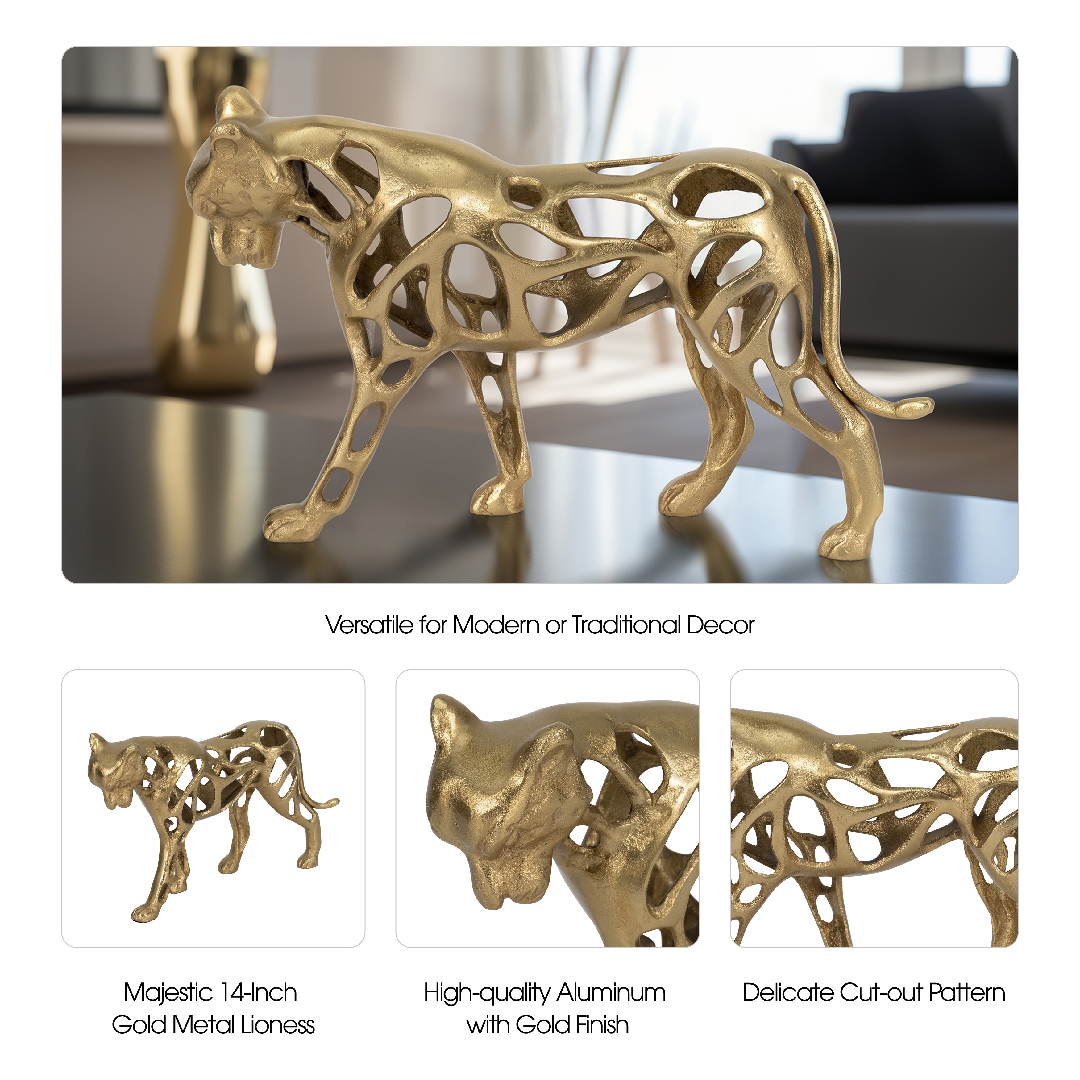 Unleash the spirit of the savannah with this exquisite 14" Golden Lioness Figurine. Crafted from durable aluminum with a lustrous gold finish, this stunning piece embodies grace and strength. At 14"Lx4"Wx8"H, this lioness adds a touch of wildlife majesty to your space, perfect for collectors and animal lovers alike. Dive into the wild of home decor with this elegant figurine and give your home an aura of untamed beauty. Update your figurine collection with this symbol of nobility and courage, a timeless accent in any room.