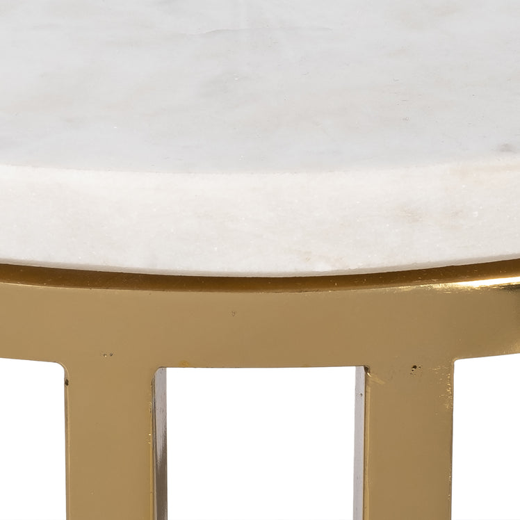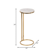Add a touch of elegance to your living room or bedroom with this stunning Metal/Marble Drink Table. The white marble top beautifully contrasts with the gold iron frame, creating a luxurious and sophisticated look. This versatile accent table can be used as a side table or accent piece in any glamorous decor setting, making it a practical and stylish addition to your home. This compact drink table is perfect for small spaces or as an accent piece.