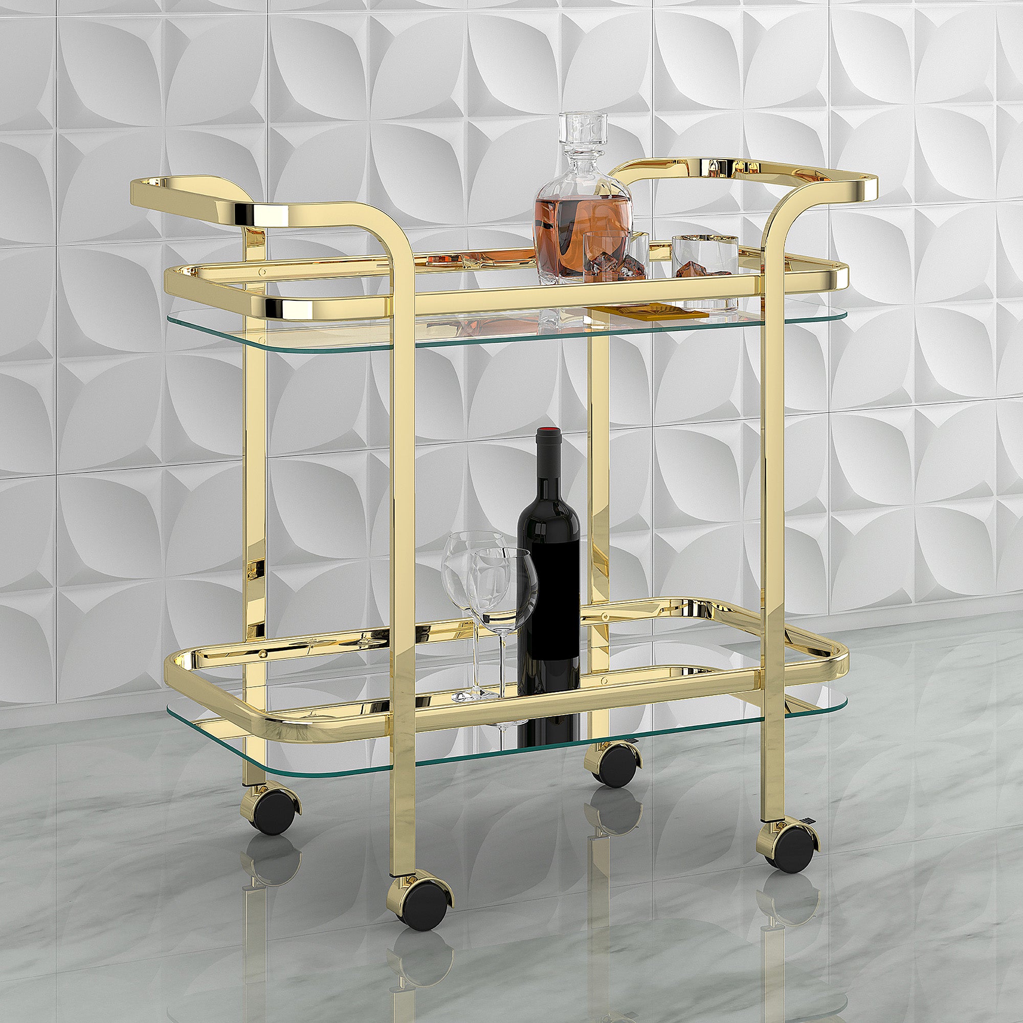 The Malibu Bar Cart is a sleek 2-tier trolley designed for both function and style. Available in gold or chrome, it features a 5mm clear tempered glass top shelf and a mirrored bottom shelf, creating an illusion of space and elegance. With 360-degree swivel wheels and locking capability, it’s effortlessly mobile yet secure. Whether used as a chic cocktail station  or sophisticated storage, this versatile piece brings a modern edge to any space.