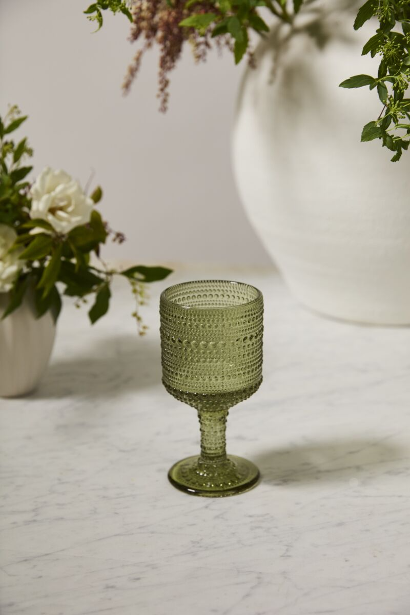 Elevate every pour with the Paloma Olive-Green Wine Glass. Crafted from solid, olive-green glass, its gently flared bowl and slender stem let aromas unfold gracefully, guiding each bouquet to your senses. The subtle raised-dot texture adds vintage charm and tactile interest, while the clean, modern silhouette ensures a timeless presence on any tabletop. Ideal for reds, whites, and everything in between, this glass balances form and function—enhancing clarity and temperature retention—so you can savor every note, swirl, and sip in style.