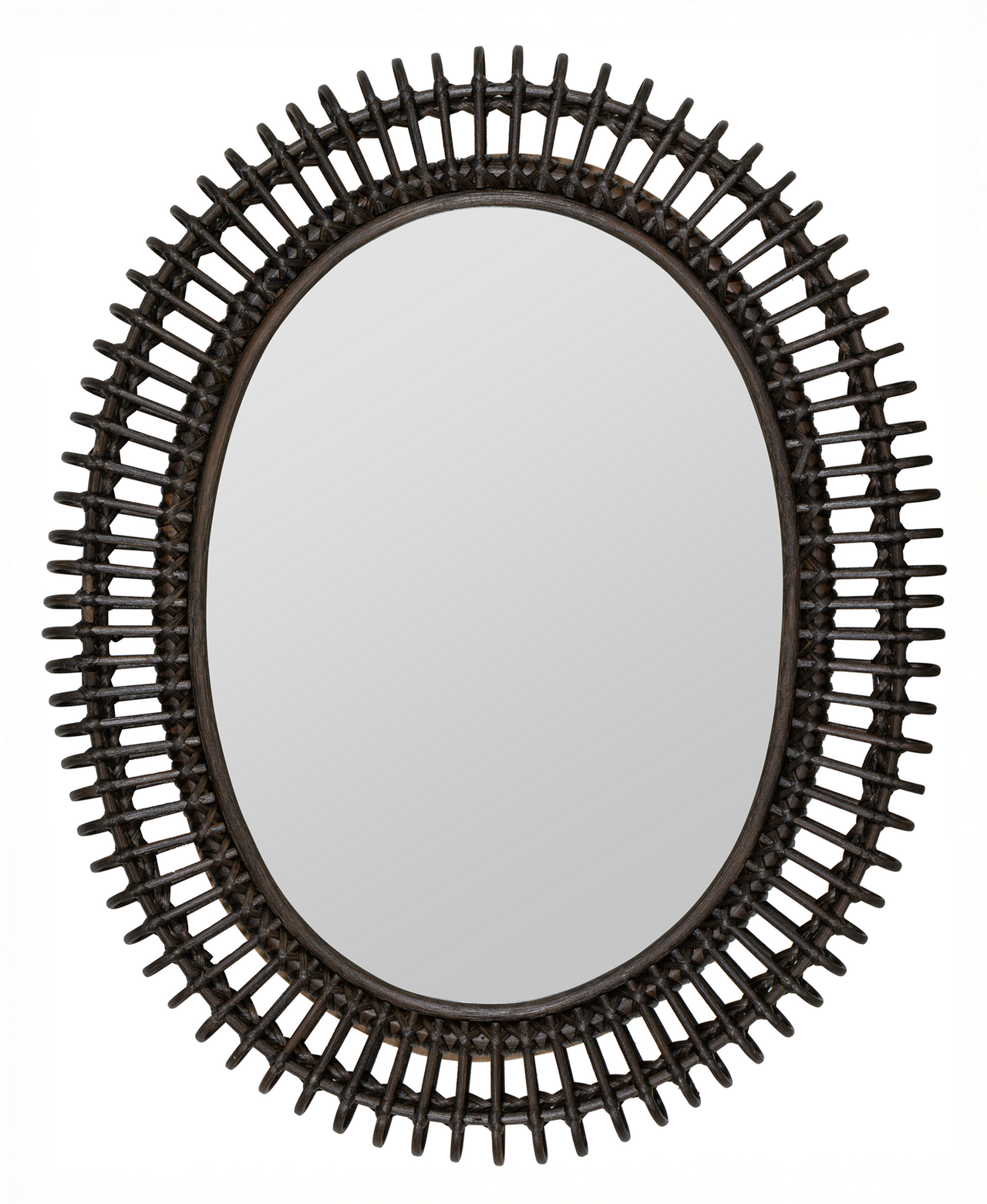 The Pierre Wall Mirror combines organic texture with contemporary elegance. Carefully handcrafted from rattan with a dark wood finish, its oval frame showcases a unique double-layered design that introduces refined depth and visual appeal. Ideal for placement above a console, vanity, or entryway, this mirror adds both warmth and architectural interest to any space. Features include a rattan construction finished in dark wood and a distinctive oval shape with layered detailing.