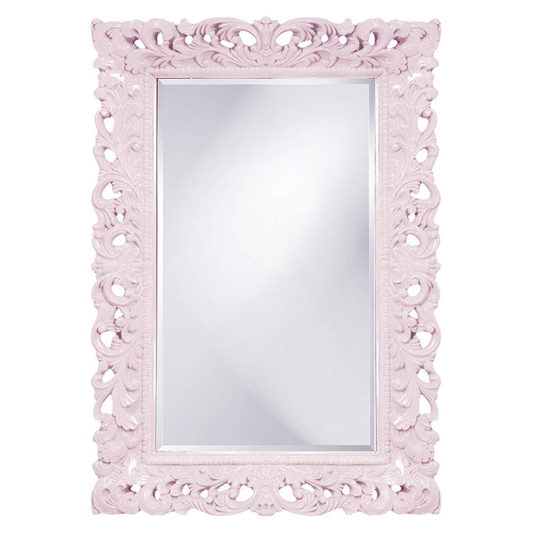 Designed for bold expression, this mirror features an elegantly detailed rectangular frame adorned with ornamental scrolls and decorative flourishes, all finished in a sophisticated glossy lilac purple lacquer. This rich, colorful finish is balanced by a beveled mirrored glass that adds dimensional depth and captivating visual interest. Offered in 13 stunning colors, the Solana transforms to match your exact vision, ensuring your décor is as unique as you are.
