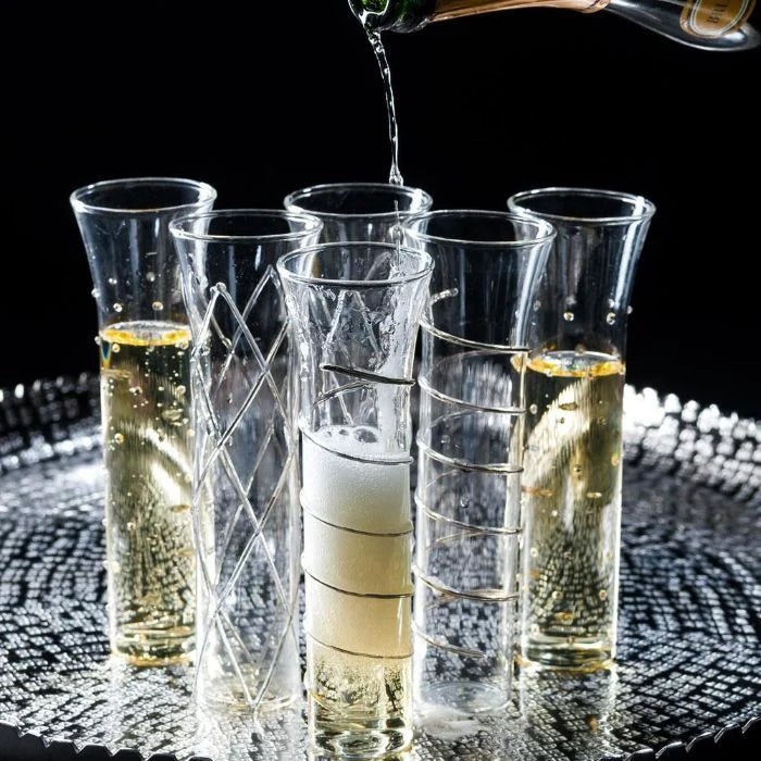 Elevate your celebratory moments with the Abeke Whimsical Champagne Flutes. This set of six stemless flutes is designed to bring a touch of fun and elegance to any occasion. Each glass features one of three unique designs, beautifully outlined in gold, adding a whimsical charm to your toasts. Perfectly balanced and exquisitely crafted, these flutes offer an exceptional blend of sophistication and playfulness at an attractive price.