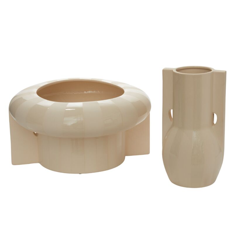 The ceramic Arlo Centerpiece Vase offers limitless creative potential, serving as either a stylish decorative object or a functional floral vessel. Its minimalist design incorporates distinctive flat handles, lending a contemporary twist to the traditional vase silhouette. Crafted from natural white clay, it showcases alternating glossy and matte stripes for a sophisticated texture. The vase’s neutral tones and striking form introduce dynamic visual interest to any interior, perfectly enhancing both vibrant fresh flowers and dried arrangements.