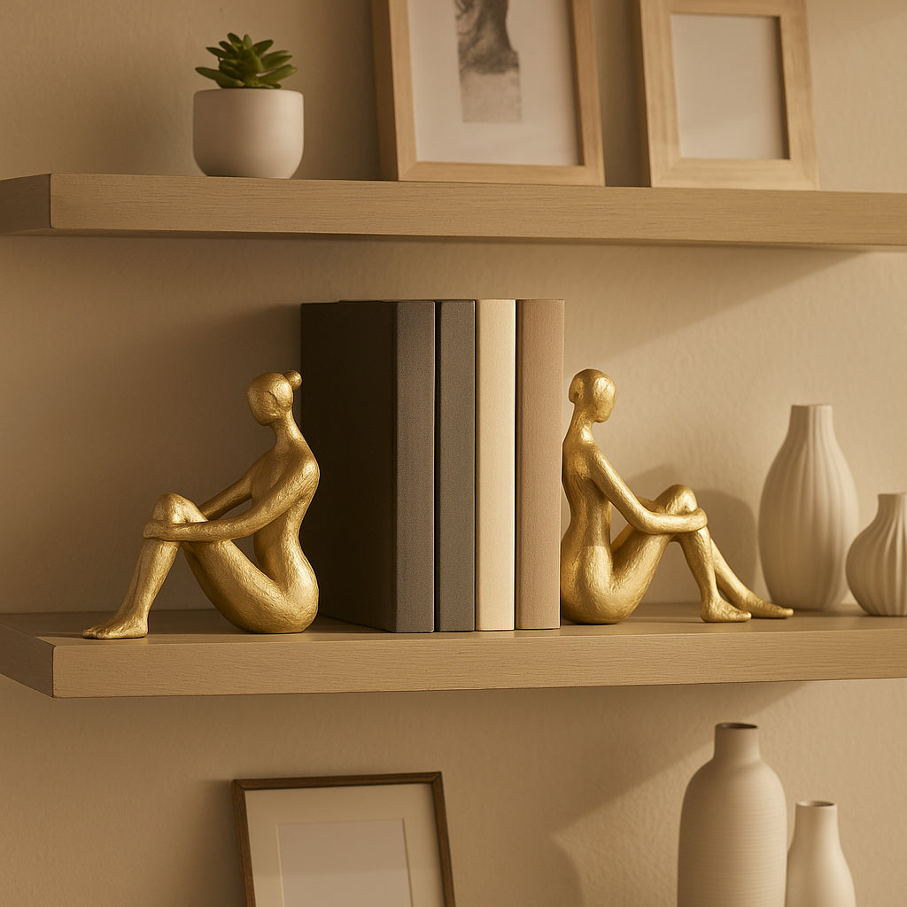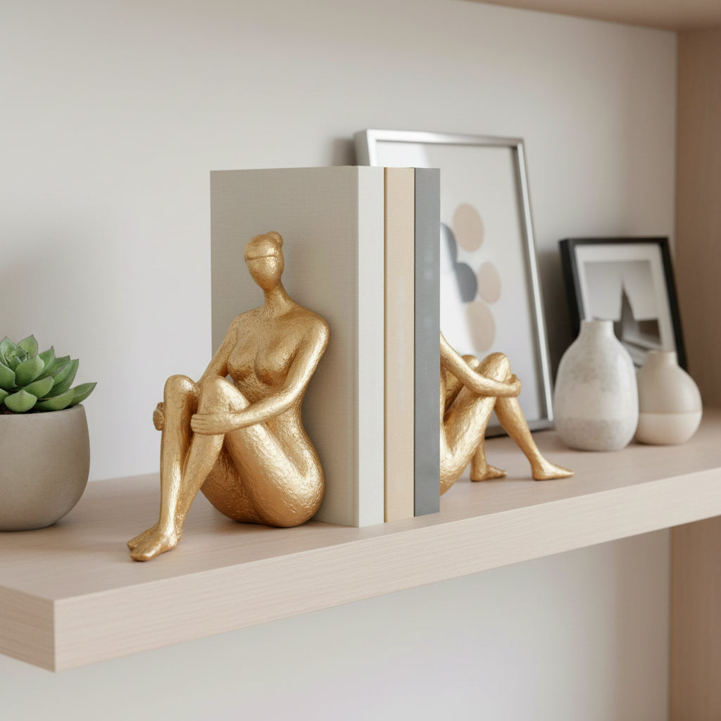 The Muse Silhouette Sculptures Bookends transform everyday storage into an artful display. Sculpted as abstract seated figures with elongated lines and fluid curves, each piece is finished in a warm, softly textured gold tone that adds depth and quiet sophistication.