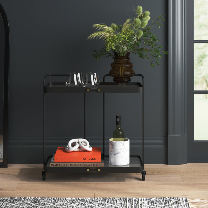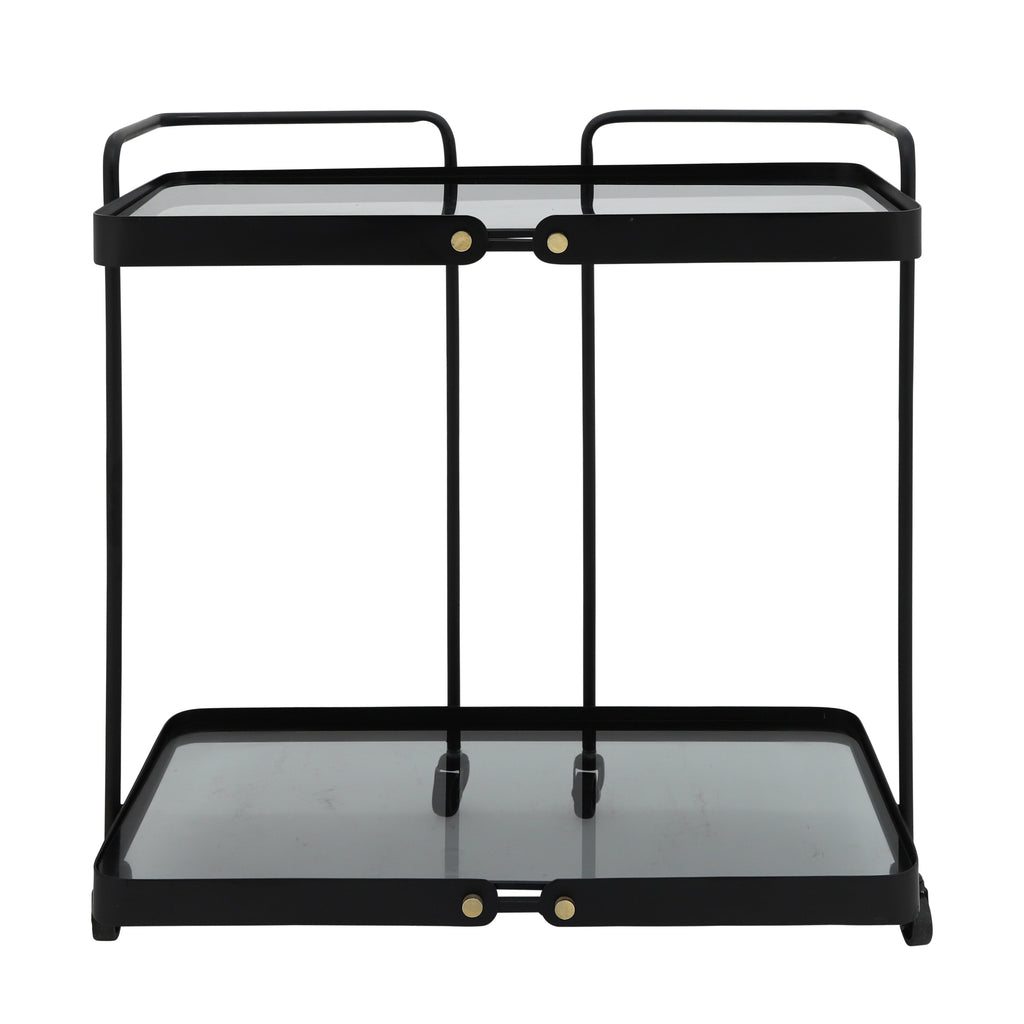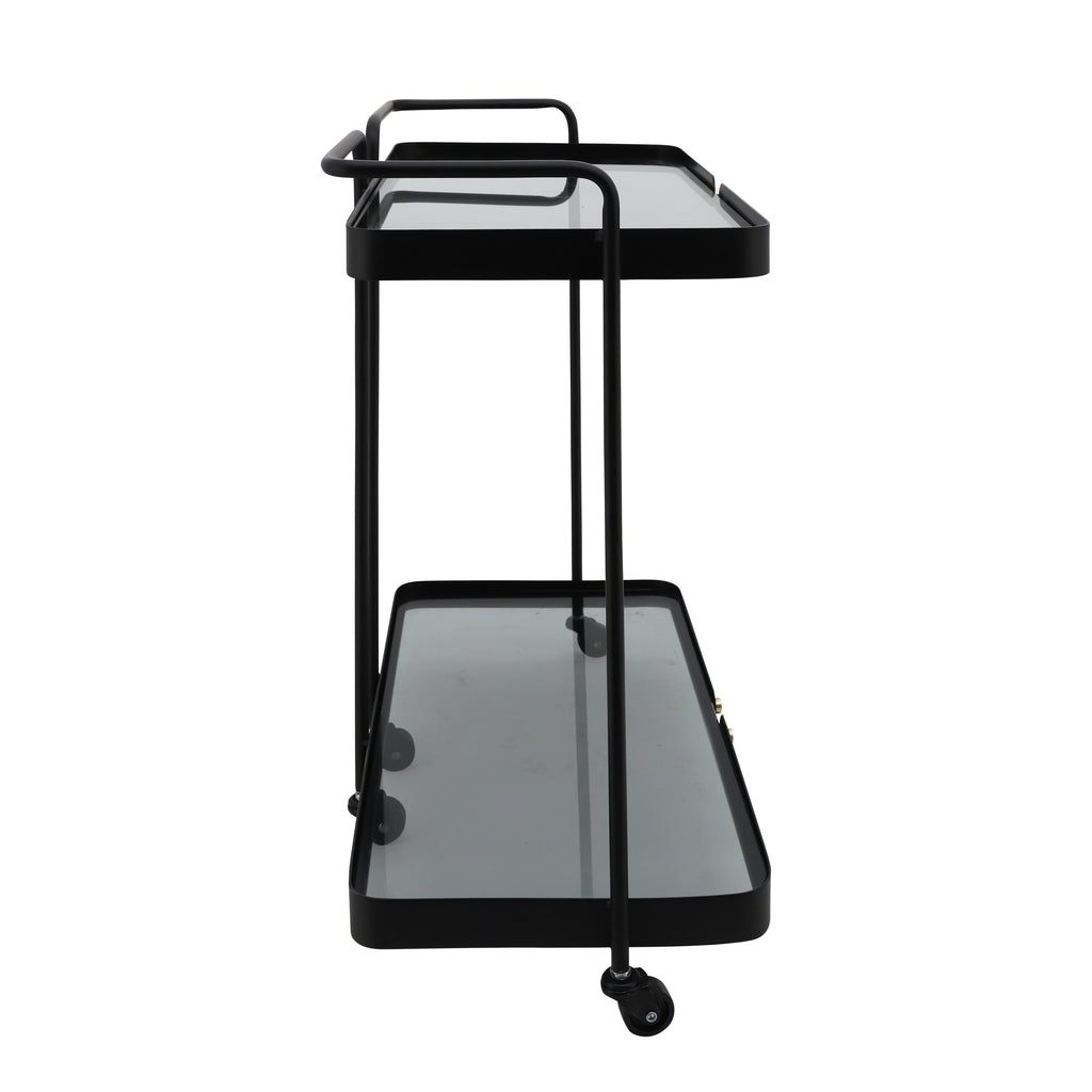The Mali Smokey Glass Bar Cart is a modern statement piece designed to elevate any space. Crafted from metal and glass, it features two tiers of smokey glass shelving, a matte black metal frame, and brass-accented hardware for a refined touch. Its clean lines and minimalist design make it perfect for serving drinks, displaying barware, or adding a sophisticated storage solution to your home.