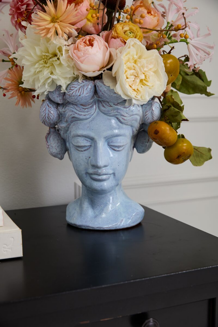 Transform your space with the enchanting Lady Lemon Vase, a 9.25" x 8" x 9" Grecian goddess-inspired ceramic masterpiece featuring a serene face with delicately closed eyes and hand-applied lemon details around the opening. This stunning white glazed ceramic piece showcases exceptional handmade craftsmanship, making each vase unique while providing ample space for lush floral arrangements or serving as a sculptural statement piece on its own. Perfect for those who appreciate classical art meets modern functionality, the Lady Lemon Vase adds sophisticated whimsy to any space when purchasing multiples.
