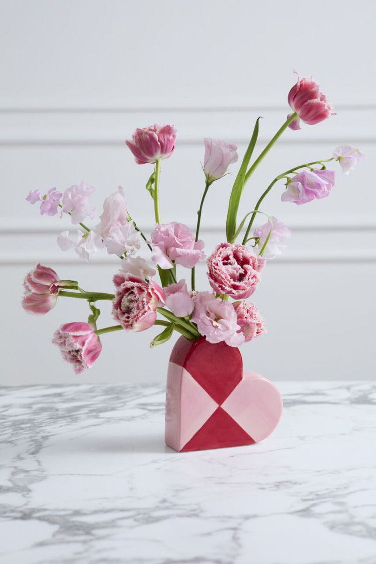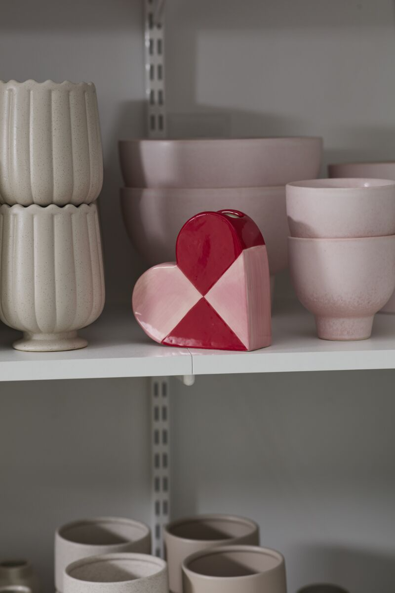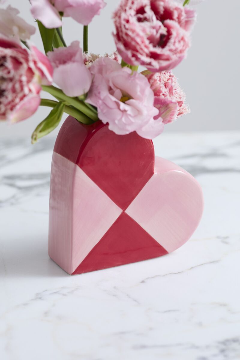 Give someone special a little love with the ceramic Queen of Hearts Budvase. This heart-shaped vessel sits on its side with a flattened silhouette and features large-scale hand painted pink and red color blocking. Its shape is easy for lining up on retail shelving, perfect for florists, plant shops, or home and gift stores. Fill with flowers, colorful pens and pencils, or lollipops for a teacher, valentine, or Galentine.