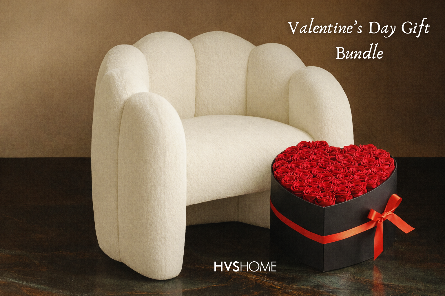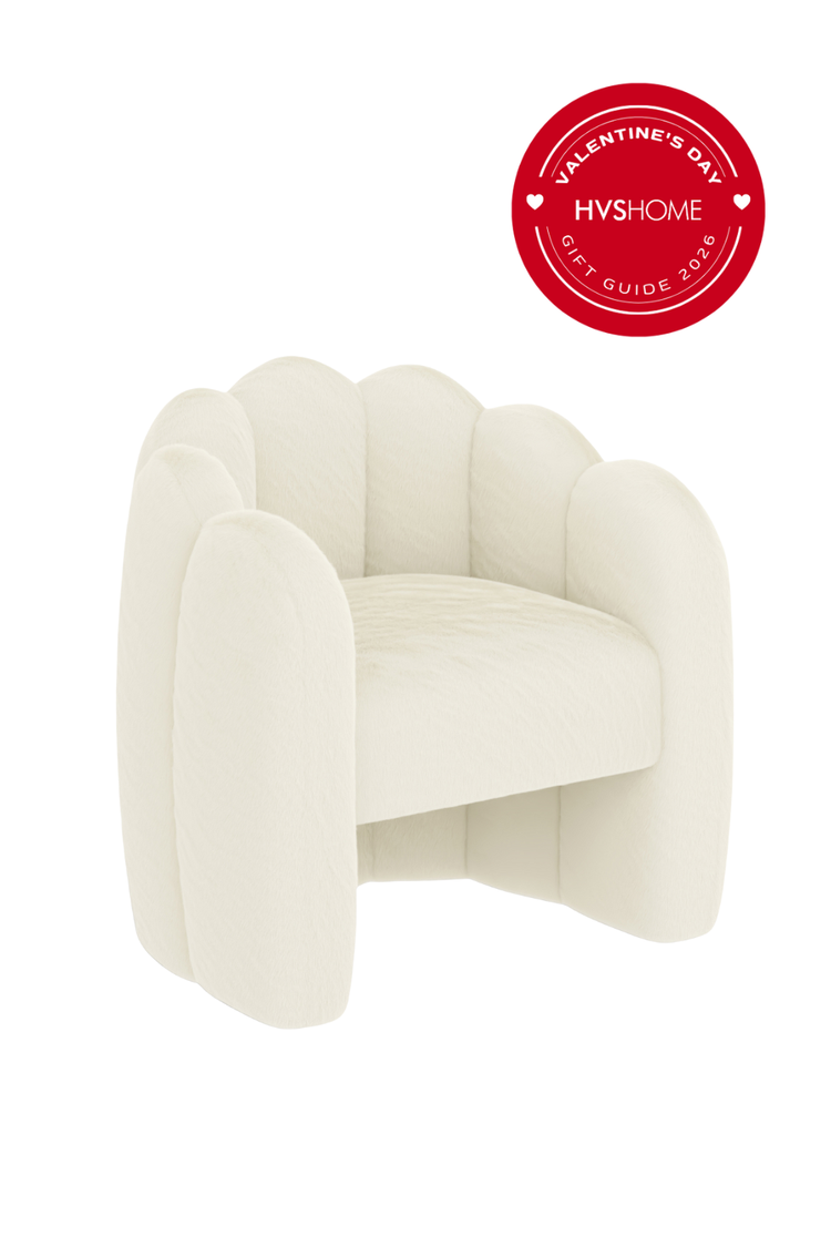 Make a lasting impression this Valentine’s Day with the Simone Ivory Bouclé Accent Chair + Box of 100 Preserved Roses Gift Set — a thoughtfully curated pairing of comfort, elegance, and romance.